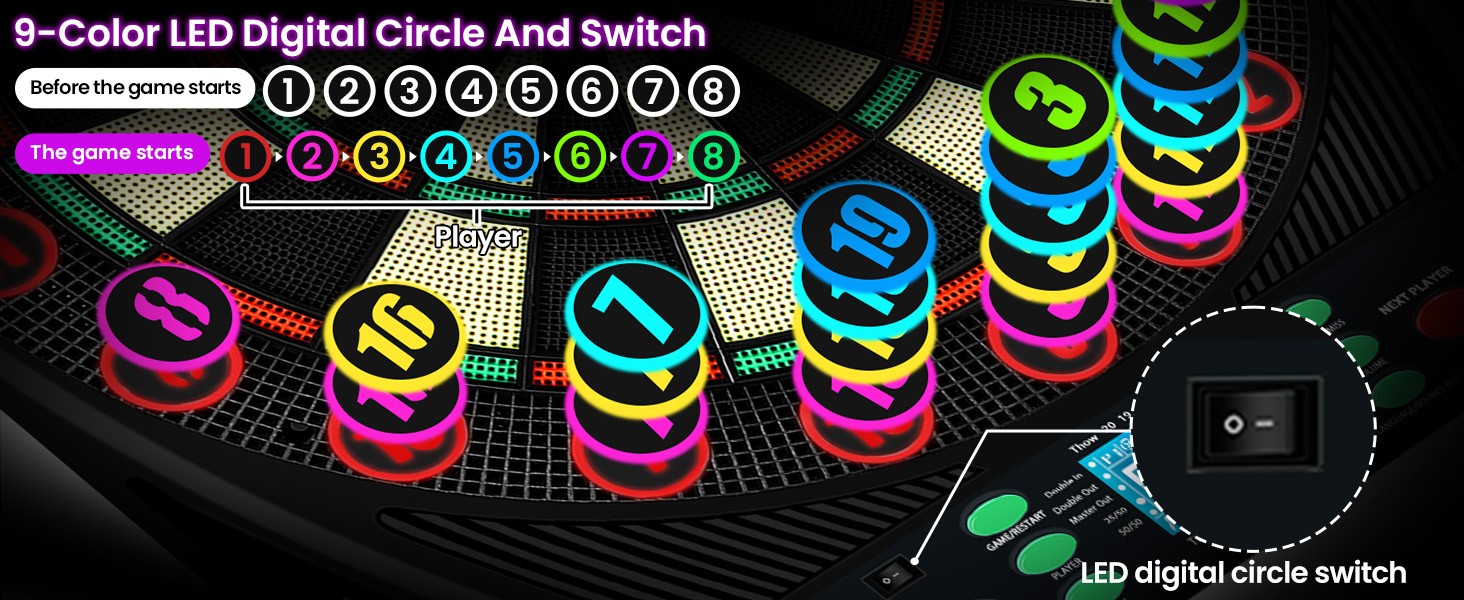 حلقة أرقام مضيئة بتسعة ألوان وشاشة LED بإضاءة خلفية: تتميز لوحة السهام الإلكترونية بمفتاح تحكم في الضوء لحلقة الأرقام الخارجية. يمكنك تشغيل الضوء في حلقات الأرقام أو إيقاف تشغيله حسب الحاجة. قبل أن تبدأ اللعبة، يكون ضوء حلقة الأرقام باللون الأبيض. بعد بدء اللعبة، يمثل كل لاعب لونًا. عند تشغيل مفتاح التحكم في الإضاءة، قد تصبح الشاشة أكثر قتامة، وهذا أمر طبيعي. يمكن مشاهدة المحتوى الموجود على الشاشة المضيئة للوحة رمي السهام على مسافة 2 متر