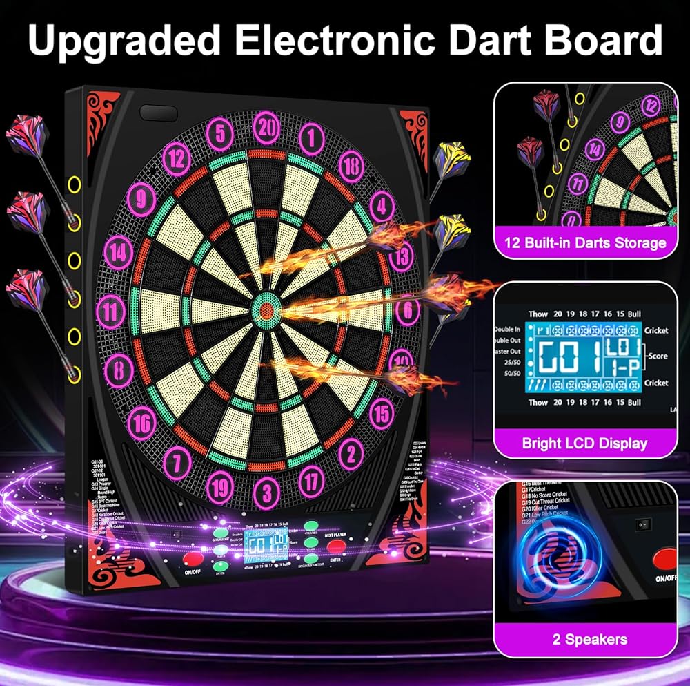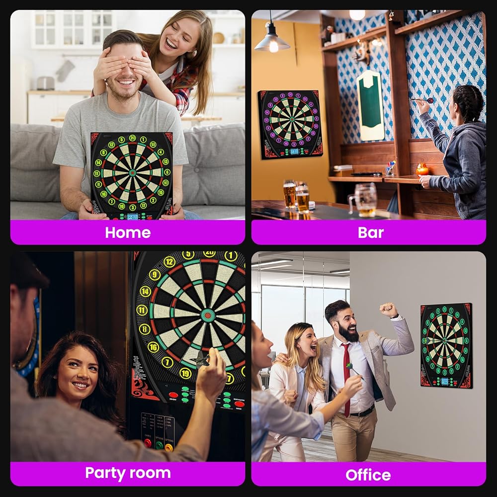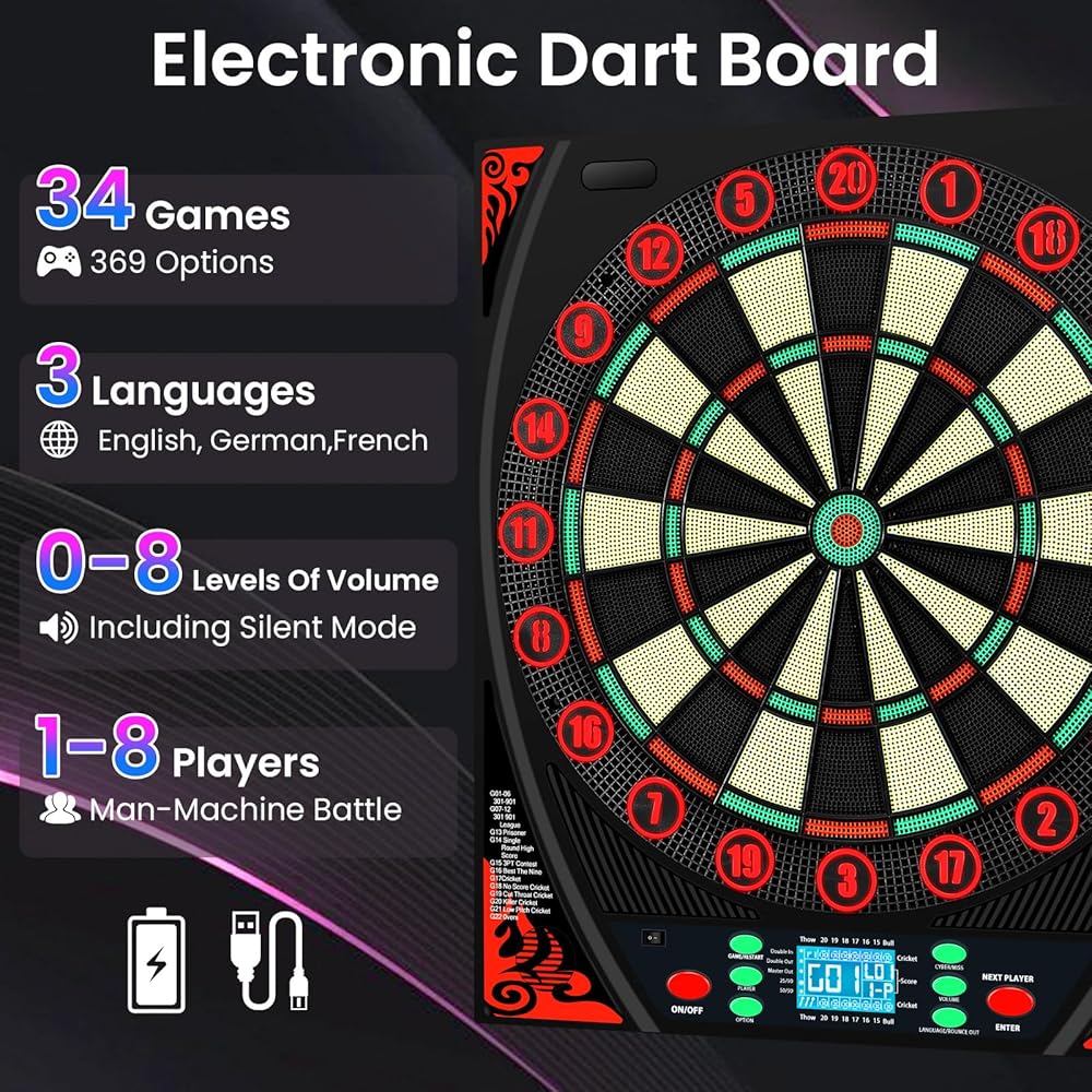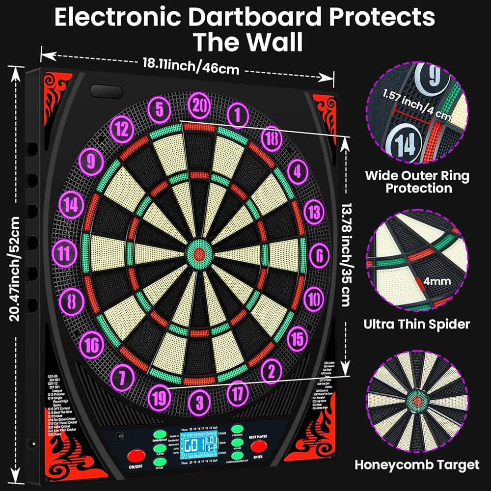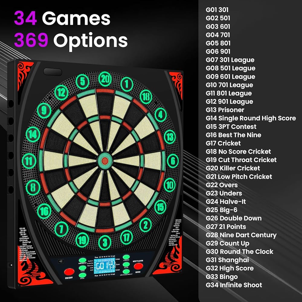 لوحات رمي السهام الإلكترونية للبالغين مع حلقة أرقام مضيئة، شاشة LED بإضاءة خلفية، مطالبات صوتية، لوحة رمي السهام الكهربائية مع 34 لعبة و369 خيارًا، لوحة رمي السهام الإلكترونية ذات الطرف الناعم لعدد 1-8 لاعبين
