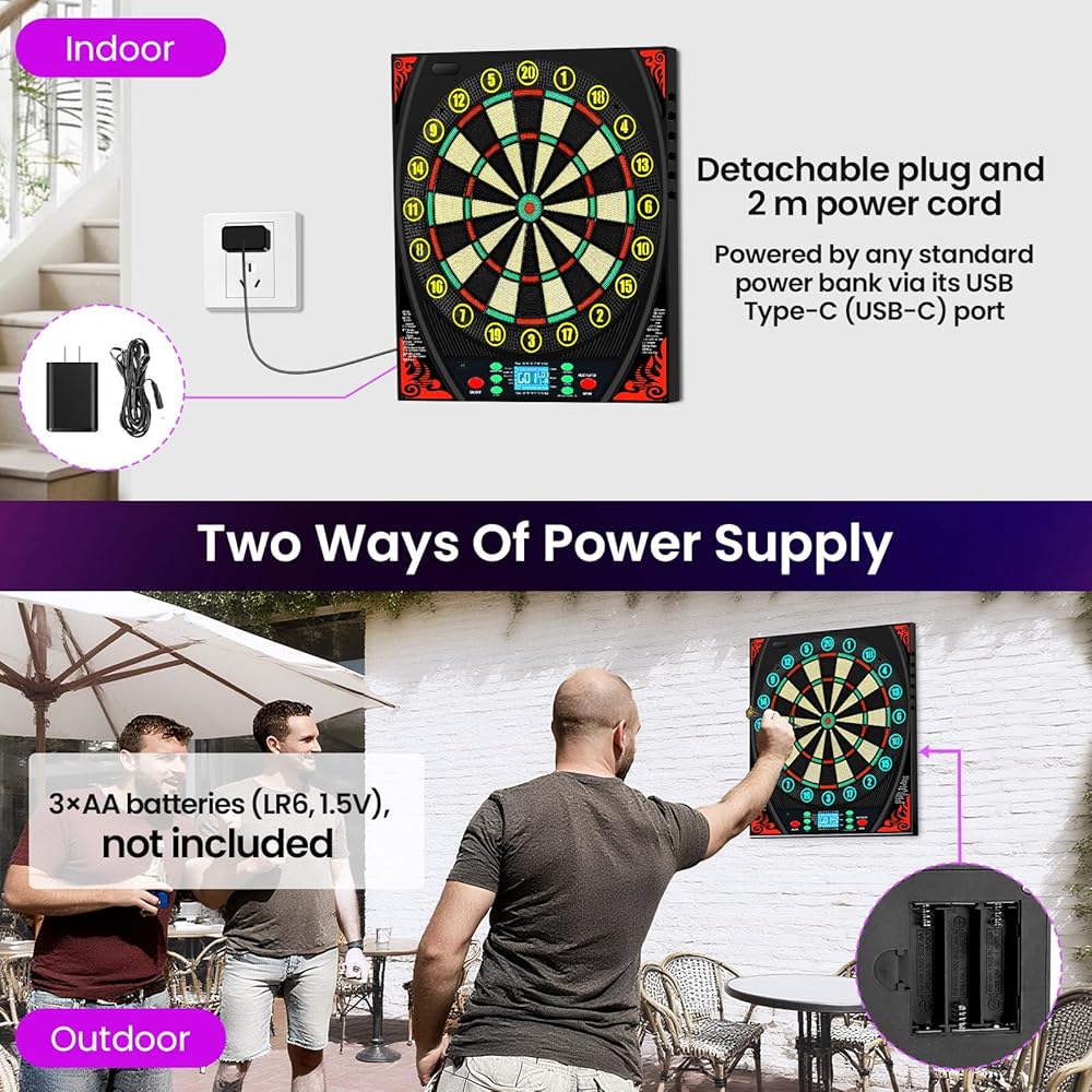 يعمل بالبطارية أو محول الطاقة: يمكنك تأمين لوحة رمي السهام ذات الطرف الناعم باستخدام البراغي المتضمنة ومسامير التوسيع، أو تعليقها وإزالتها في أي وقت. يتم تشغيل لوحة رمي السهام الكهربائية بمحول الطاقة المتضمن بطول 2 متر أو 3 بطاريات AA (غير متضمنة). يمكنك أيضًا تشغيله عبر منفذ USB من النوع C (USB-C) باستخدام بنك طاقة قياسي. يمكنك لعب السهام في أي وقت في المنزل أو المكتب أو الحديقة أو الحفلات أو الحانات أو المرآب أو في الداخل أو الخارج مع العائلة أو الأصدقاء.