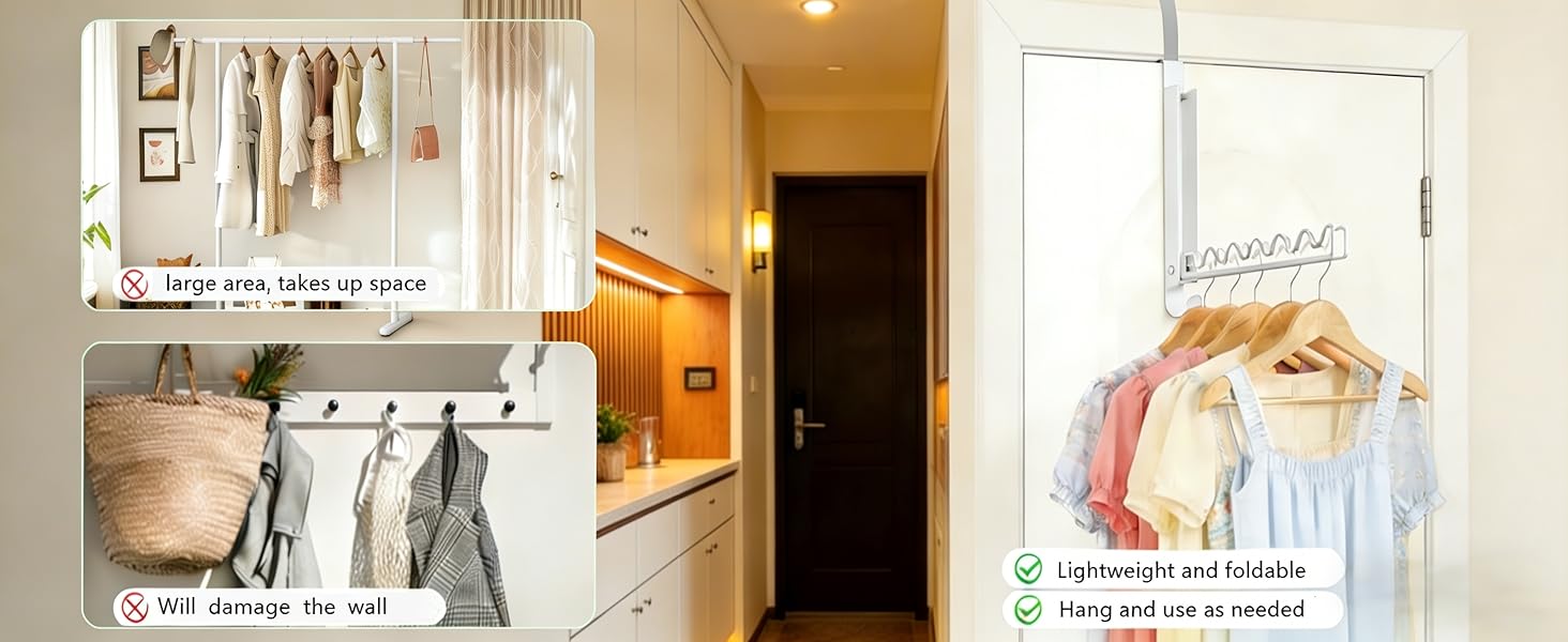 OVER DOOR DESIGN: White metal hanger rack designed to hang over standard doors, providing convenient storage without drilling holes or damaging walls