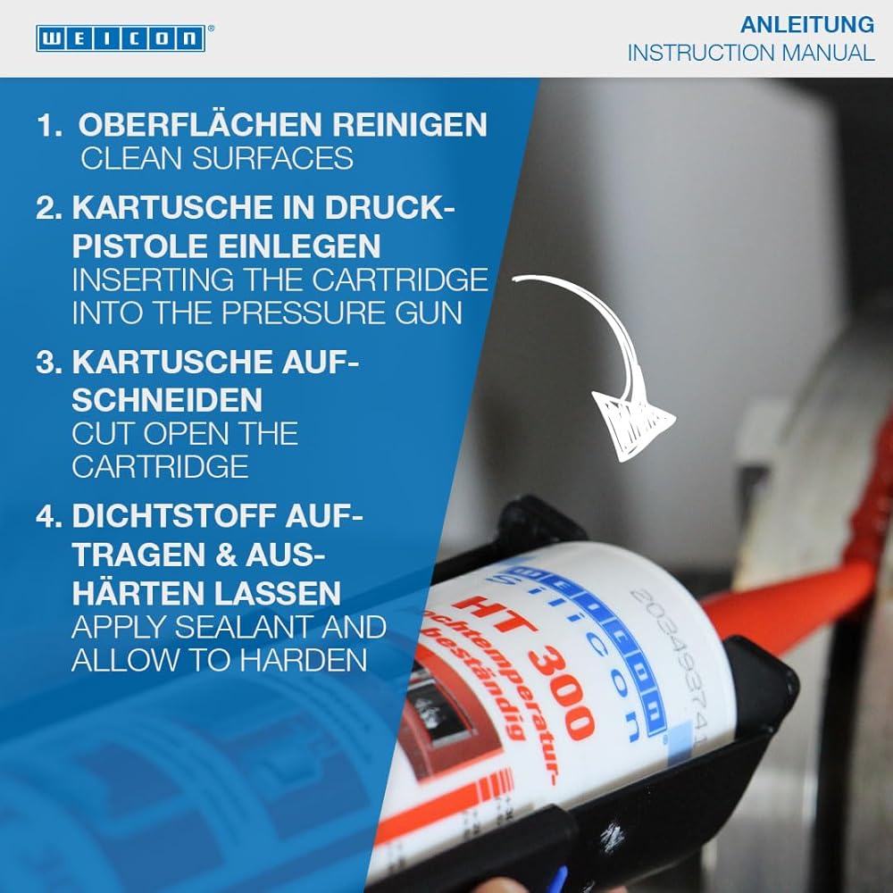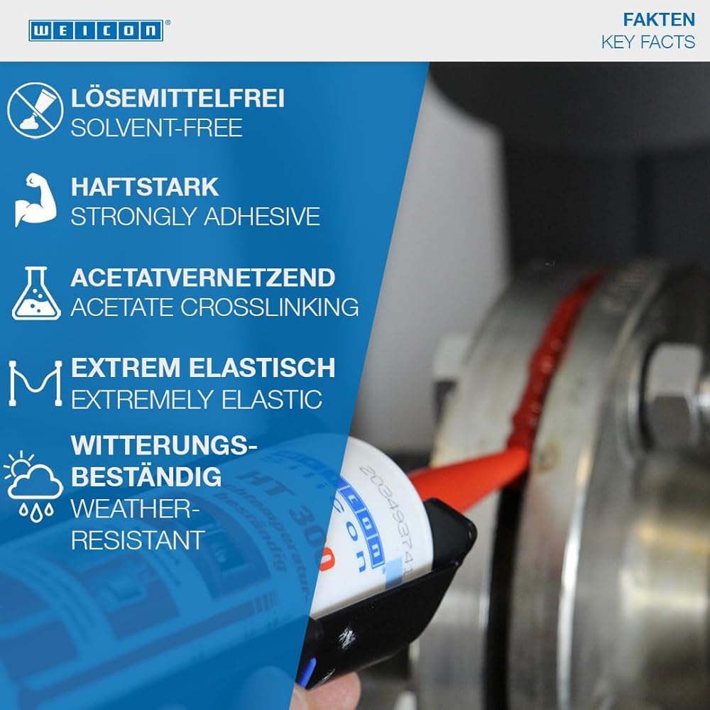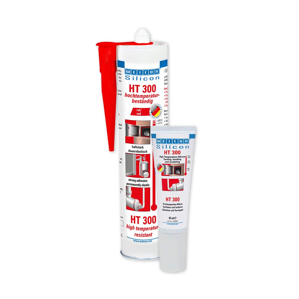WEICON Silicone HT 300 85 ml red PROPERTIES: WEICON HT 300 is resistant to high temperatures (+300°C|+572°F), solvent-free, strongly adhesive, acetate cross-linking, weathering, ageing and chemical resistance, and extremely elastic. APPLICATION: The silicone adhesive can be used as a sealant in many areas - whether oven, oven door, stove pane, fireplace, fireplace glass, oven, ceramic hob, gas cooker, electric cooker, boiler, chimney flap, exhaust pipe, gas heating or camping heating. HT 300 adheres very well to steel, aluminium, glass, ceramic and many other materials. PROCESSING: Clean and degrease surface. Squeeze the tube by hand and close it again immediately after use. Use opened tubes as quickly as possible. To ensure optimum wetting, the adhesive parts must be joined before the first skin has formed on the adhesive. STORAGE: WEICON Elastic Adhesives and Sealants have a shelf life of 12 months when stored unopened and in normal climate (+23°C and 50% relative humidity). SAFETY: When processing WEICON products, the physical, safety, toxicological and ecological data and regulations of the EC Safety Data Sheets must be observed. TECHNICAL DATA: Basis: 1 K polysiloxane (acetate). Viscosity: paste-like. Elongation at break according to ISO 37: 300 %. Tensile strength according to ISO 37: 2 5N|mm. Temperature resistance: -40 to +280 short term (approx 2 h) to +300 °C.