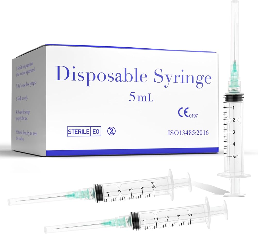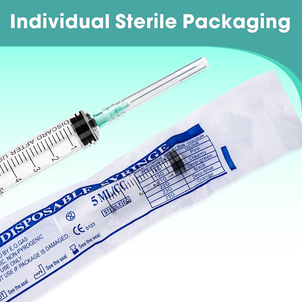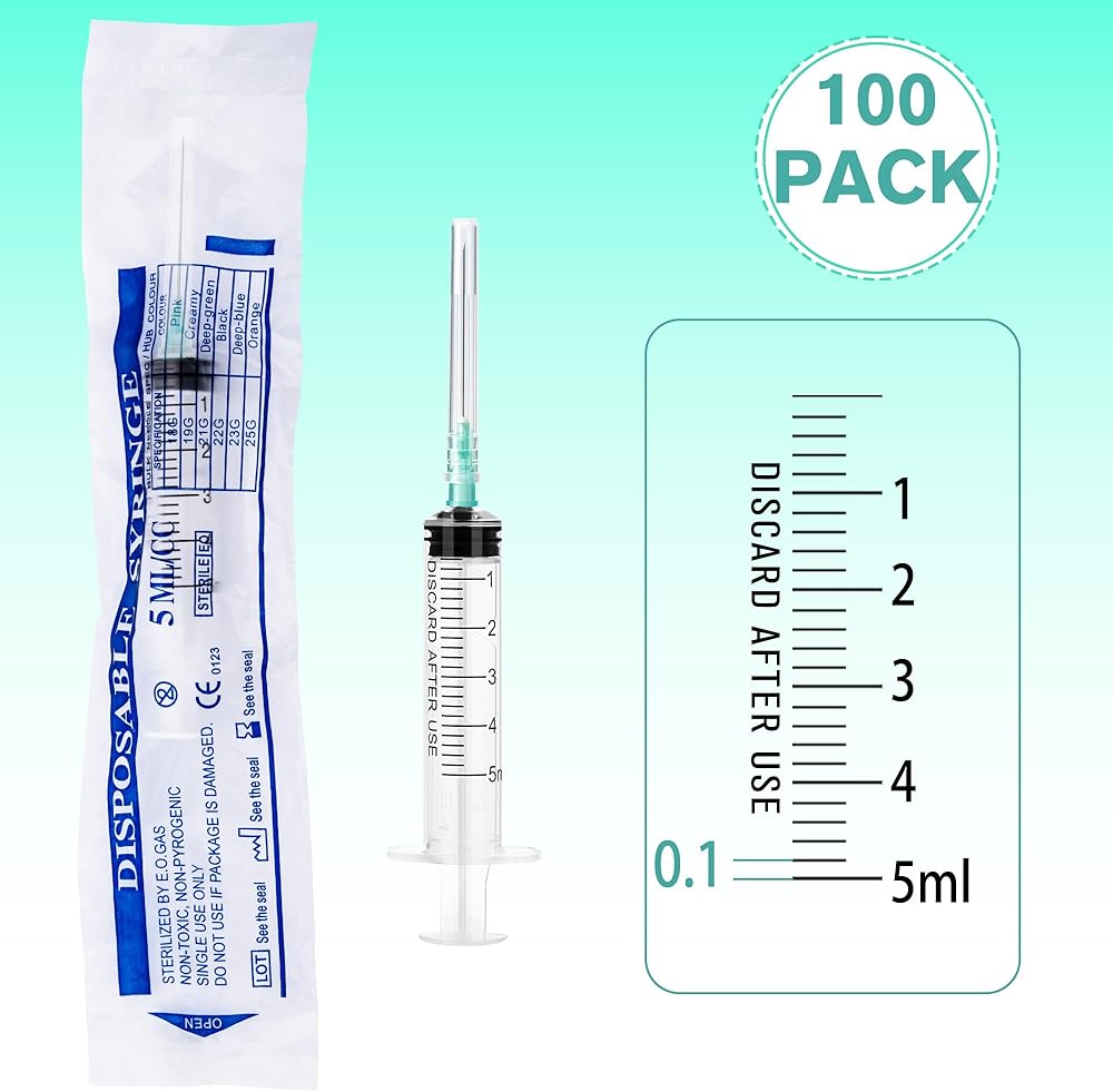 Package Includes: Value pack of 100 individually wrapped 5ml syringes with needles.