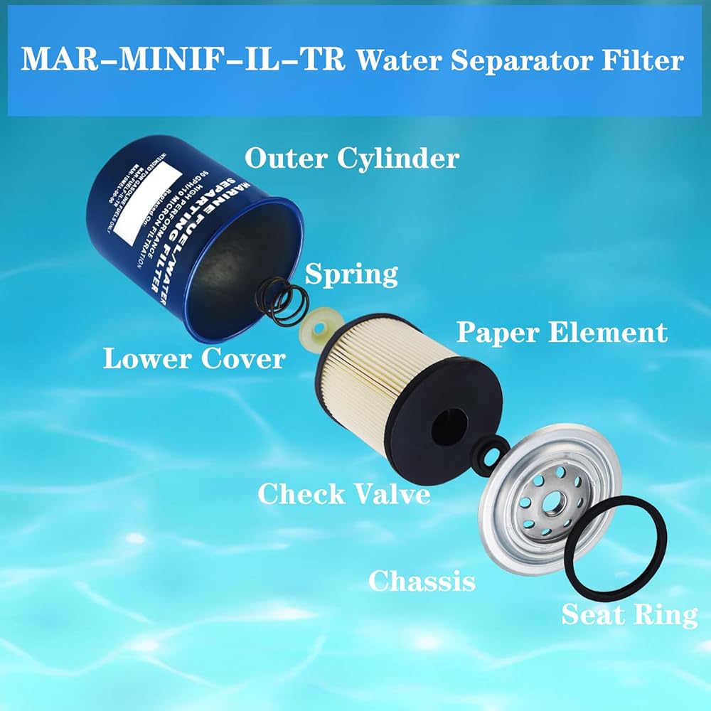 Fuel Water Separating Filter Replace: Sierra 18-7865; Ya-maha MAR-MIOAS-00-00, MAR-MINIF-IL-TR; Mallory 9-37808