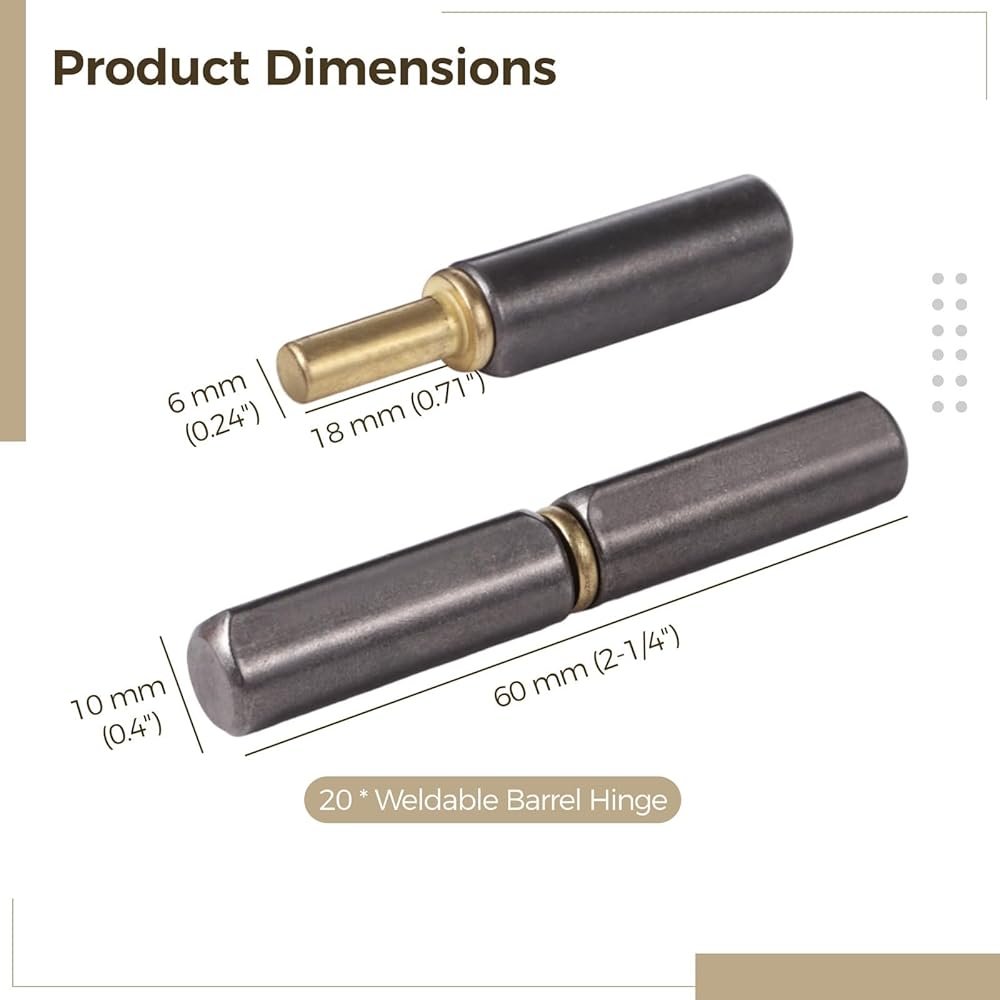 Color:Light Black Material:Carbon Steel Product Size: 0.4 x 2-1/4 in Package Includes:20 * Weldable Barrel Hinge Note: - Please refer to the measurement. Tiny measuring error is allowable in normal range. - There might be a little color difference due to the monitor, camera or other factors, please refer to the physical item.