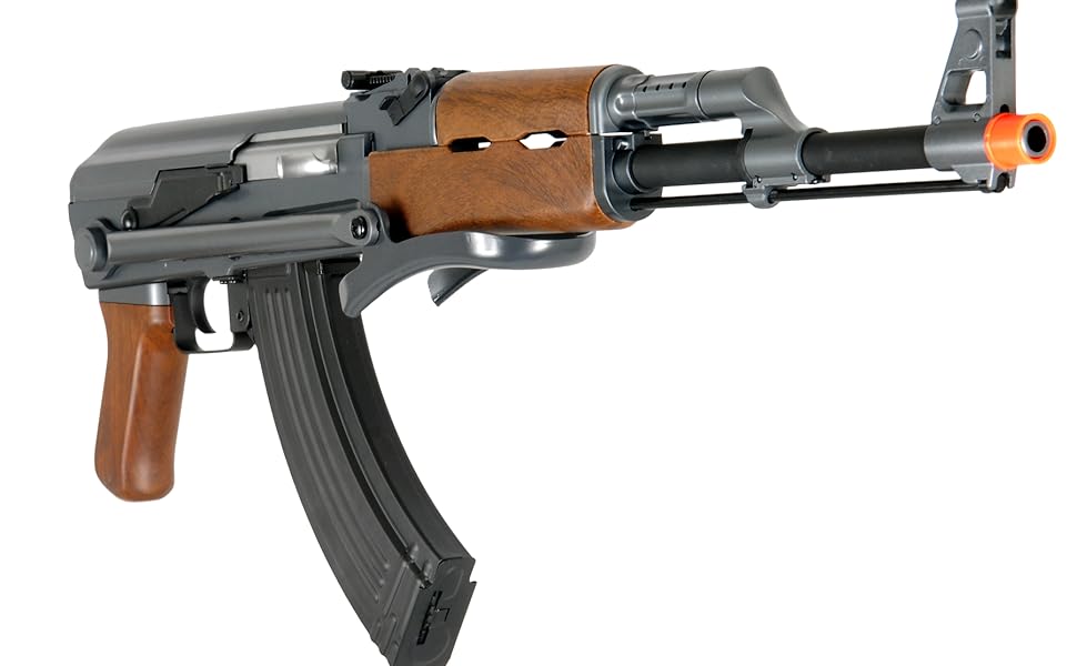 واقي يدوي وقبضة من الخشب الصناعي من أجل الأصالة: يوفر واقي اليد والقبضة من الخشب الصناعي مظهرًا وملمسًا أصيلين لمسدس airsoft، مما يجعله خيارًا رائعًا للاعبين الذين يفضلون بندقية كلاسيكية من طراز AK.