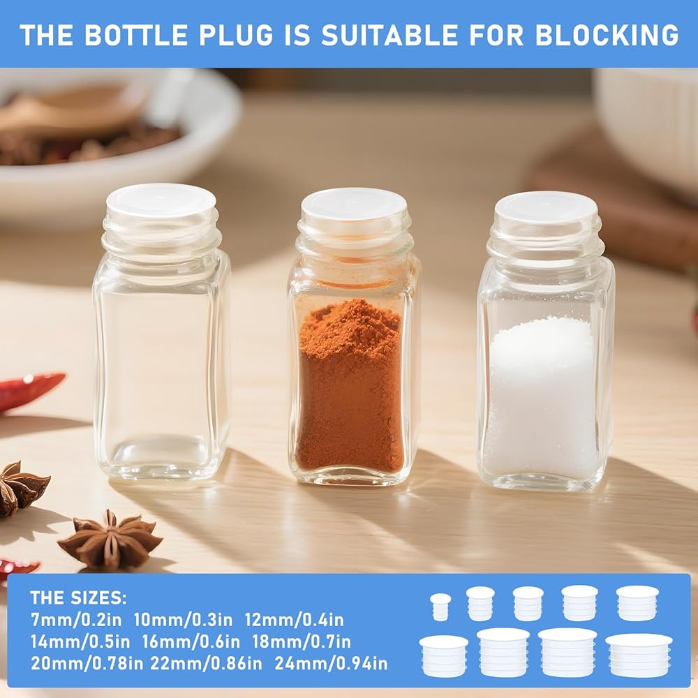 Specification: Salt and pepper shaker stoppers has nine dimensions, for each size 10, a total of 90, is suitable for the salt and pepper stoppers plugs for 7,20,16,26,12,18,22,14,24 mm plug, make sure you will find a perfect fit your bottle, the bottle stopper of whatever you are big or small, all can work seamlessly together