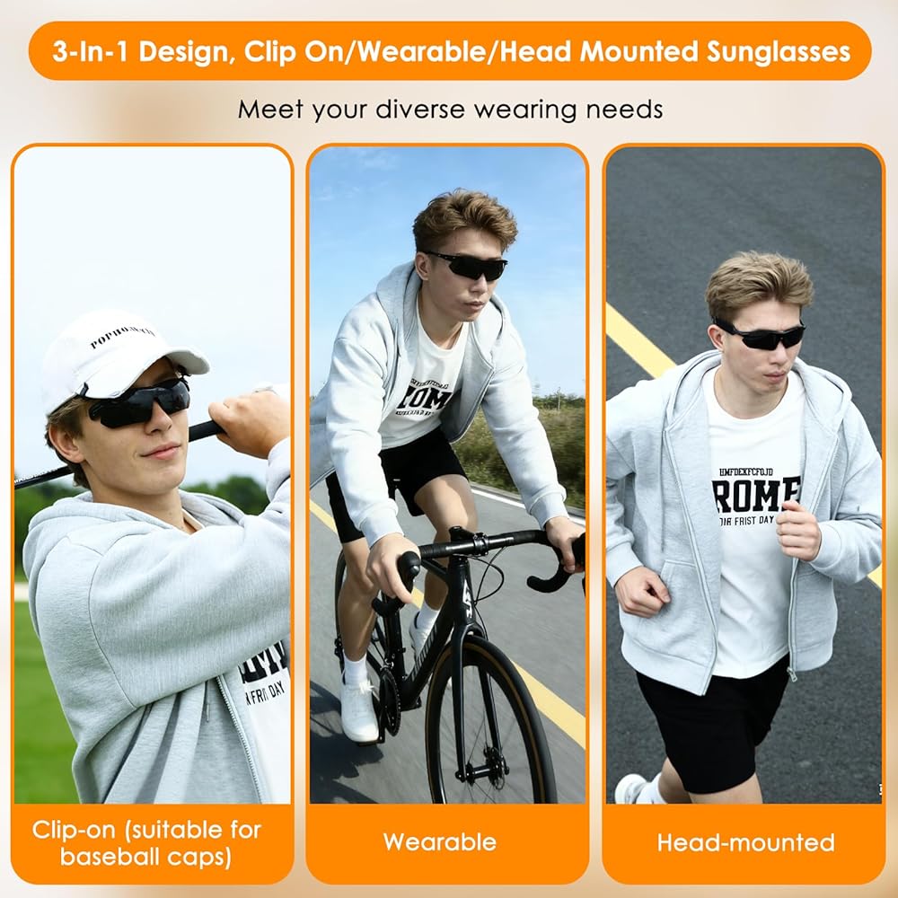 👓【تصميم 3 في 1، خيارات ارتداء مرنة】تتميز النظارات الشمسية المستقطبة الخارجية بثلاثة أنماط فريدة من نوعها للارتداء: يمكنك ارتداؤها مثل النظارات العادية، أو تثبيتها على قبعتك (مناسبة فقط لقبعات البيسبول)، أو تعليقها على رأسك بحزام الرأس. يضمن تصميم المشبك تثبيت النظارات بشكل آمن على قبعتك، مما يقلل الضغط على أذنيك. سواء كنت للتنقلات اليومية أو الأنشطة الخارجية، يمكنك اختيار نمط الارتداء الأكثر راحة وفقًا لاحتياجاتك.