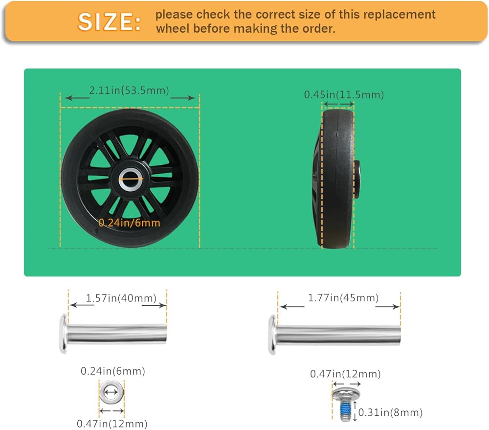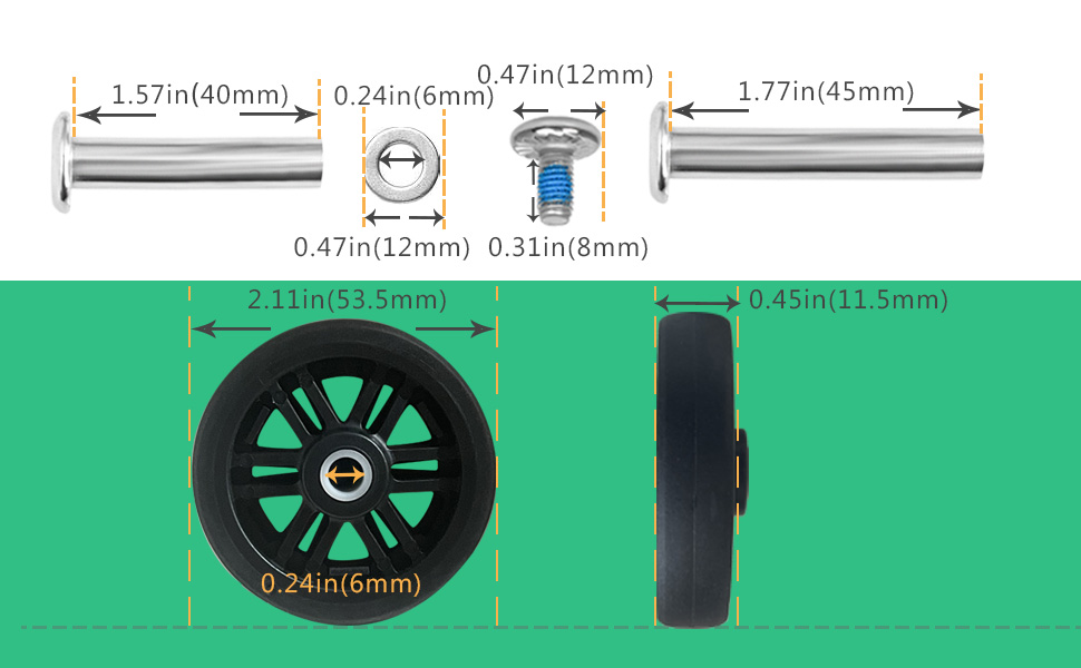 【حجم العجلة】قطر عجلة الأمتعة 2.11 بوصة (53.5 مم)، عرض الحافة 0.45 بوصة (13.5 مم)، القطر الداخلي 0.24 بوصة (6 مم).