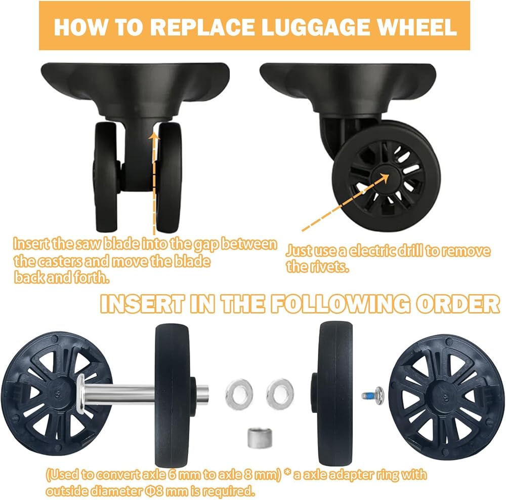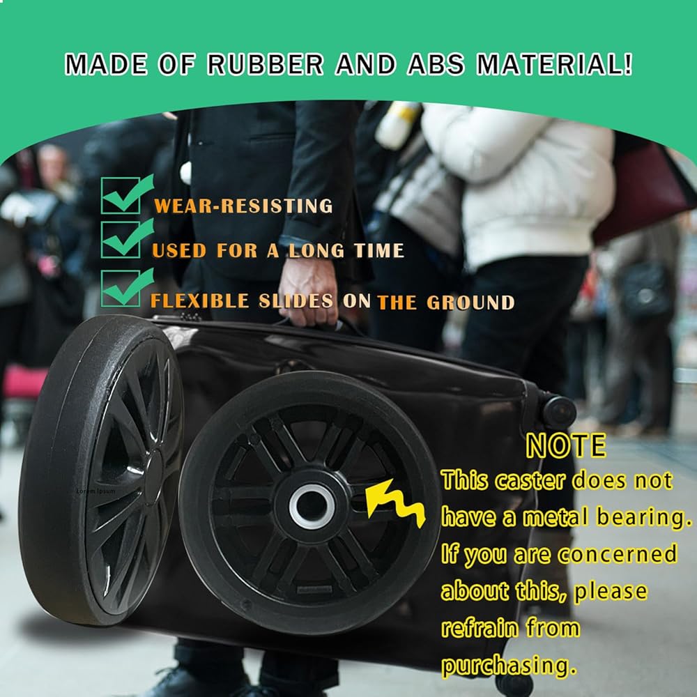 【عالية الجودة】عجلات الأمتعة مصنوعة من مطاط عالي الجودة ومادة أكريلونتريل بوتادين ستايرين عالية الجودة، ومقاومة للاهتراء، وتنزلق مرنة على الأرض، وقوية ومتينة، ويمكن استخدامها لفترة طويلة، مما يضمن أن رحلاتك آمنة ومريحة.