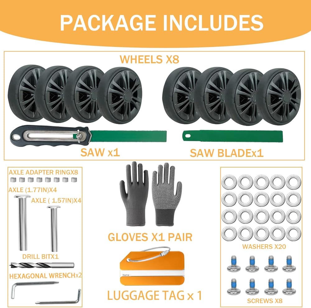 【جعلها اقتصادية】إذا طلبت من أحد المحترفين إصلاح عجلة حقيبتك، فسيتعين عليك شراء واحدة جديدة، والتي غالبًا ما تكون باهظة الثمن. باستخدام عجلات أمتعة السفر الخاصة بنا، يمكنك استبدالها بنفسك بسهولة. تناسب عجلات حقيبة السفر معظم الأمتعة بشكل مثالي، يرجى التحقق من الحجم الصحيح للعجلة البديلة قبل إجراء الطلب. وتتدحرج هذه العجلات على معظم المواد - أي أرضية أو رصيف أو أسفلت - بدون مشكلة.