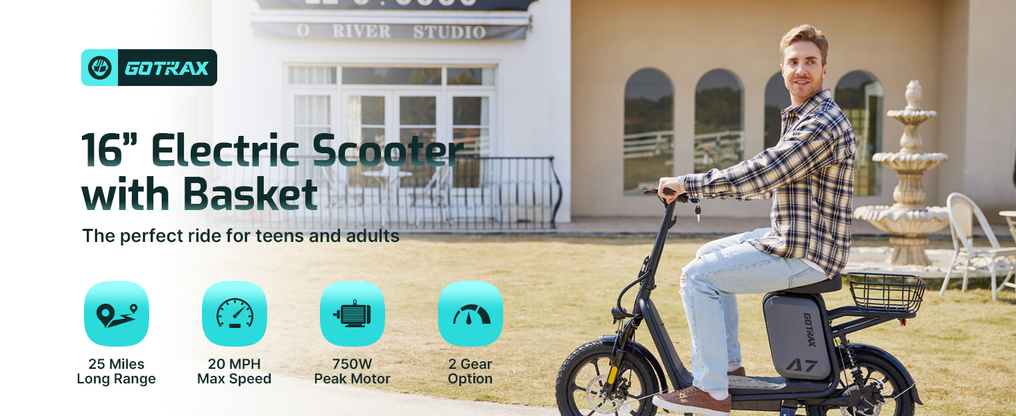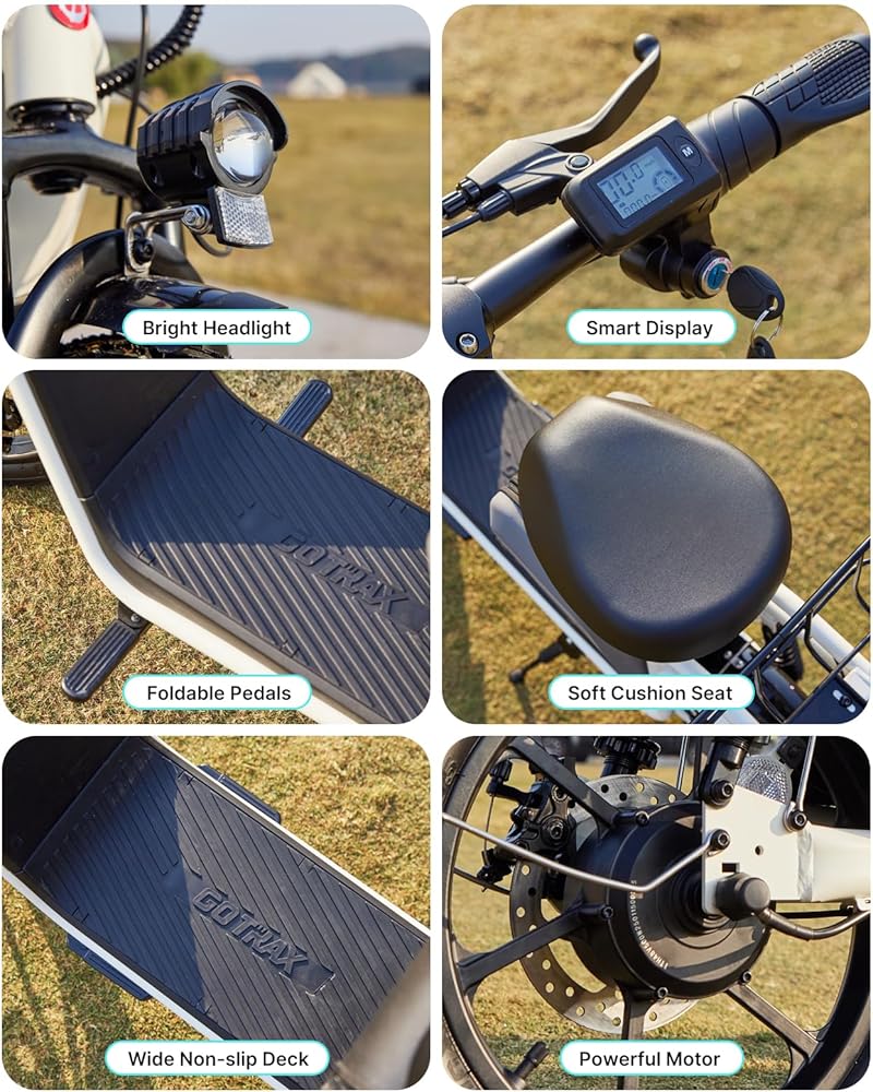【قيادة سلسة وبدون مجهود】ارفع مستوى تنقلاتك مع Gotrax A7، الدراجة الكهربائية المثالية للبالغين. يضمن نظام التعليق المزدوج والسرج الكبير المبطن والسطح العريض المضاد للانزلاق أقصى قدر من الراحة حتى في الرحلات الطويلة.