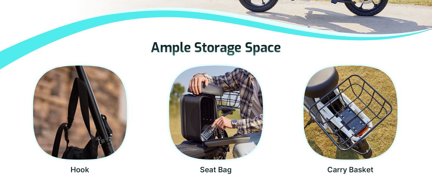 【مساحة تخزين واسعة】يأتي هذا السكوتر الكهربائي مع حقيبة مقعد واسعة وسلة خلفية، مما يجعله مثاليًا لتخزين أي بقالة. توفر مساند القدم القابلة للطي أقصى قدر من الراحة للقدم أثناء الركوب.