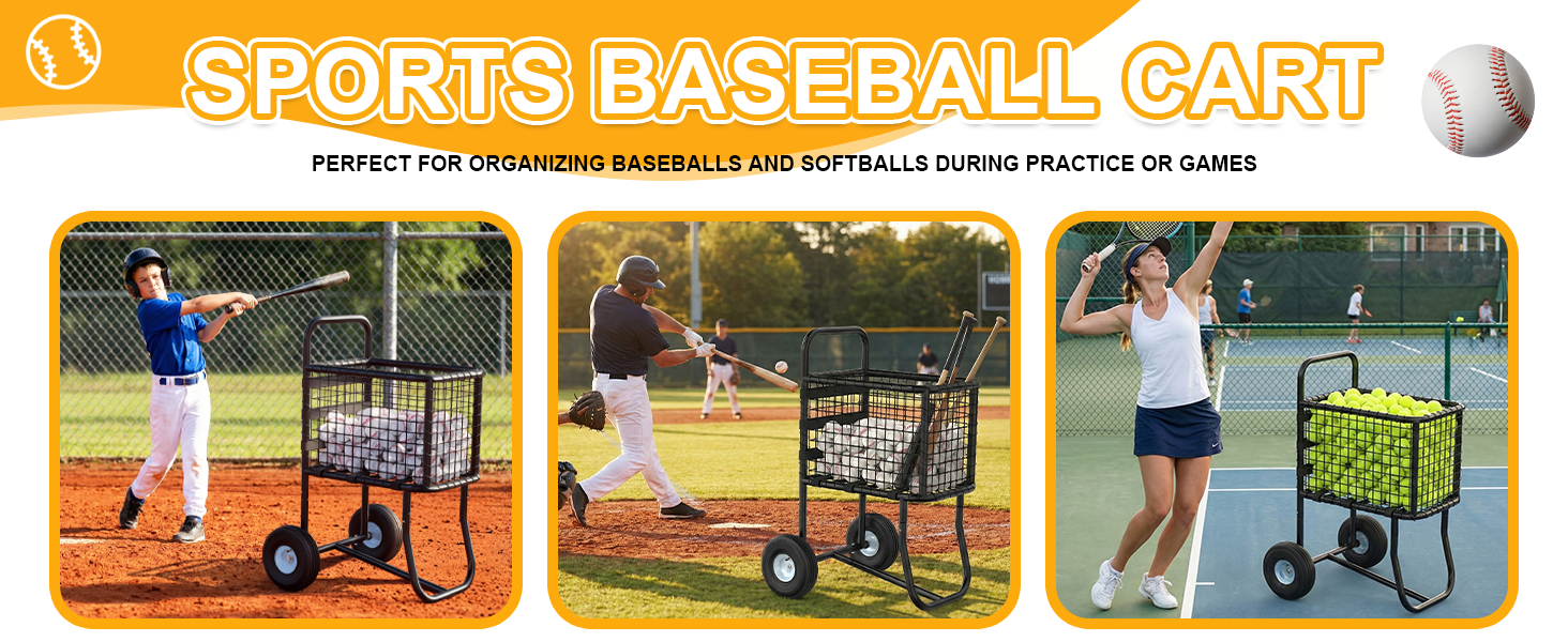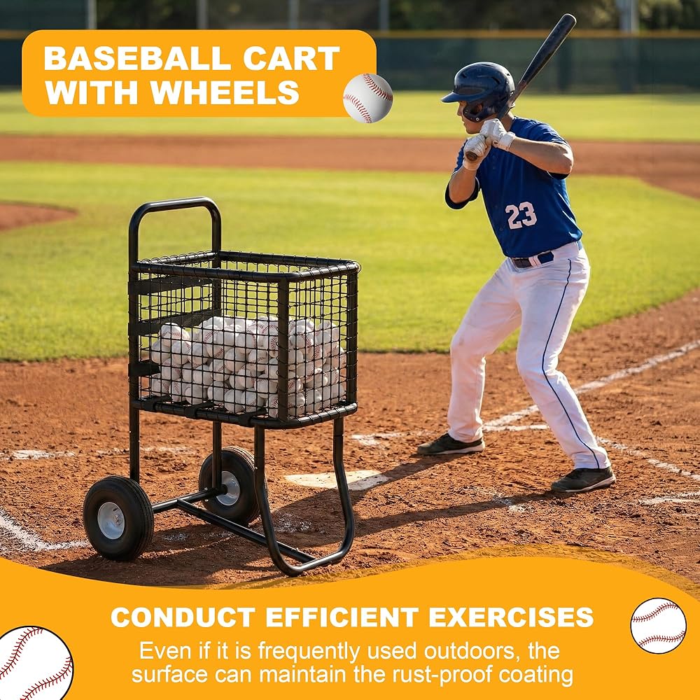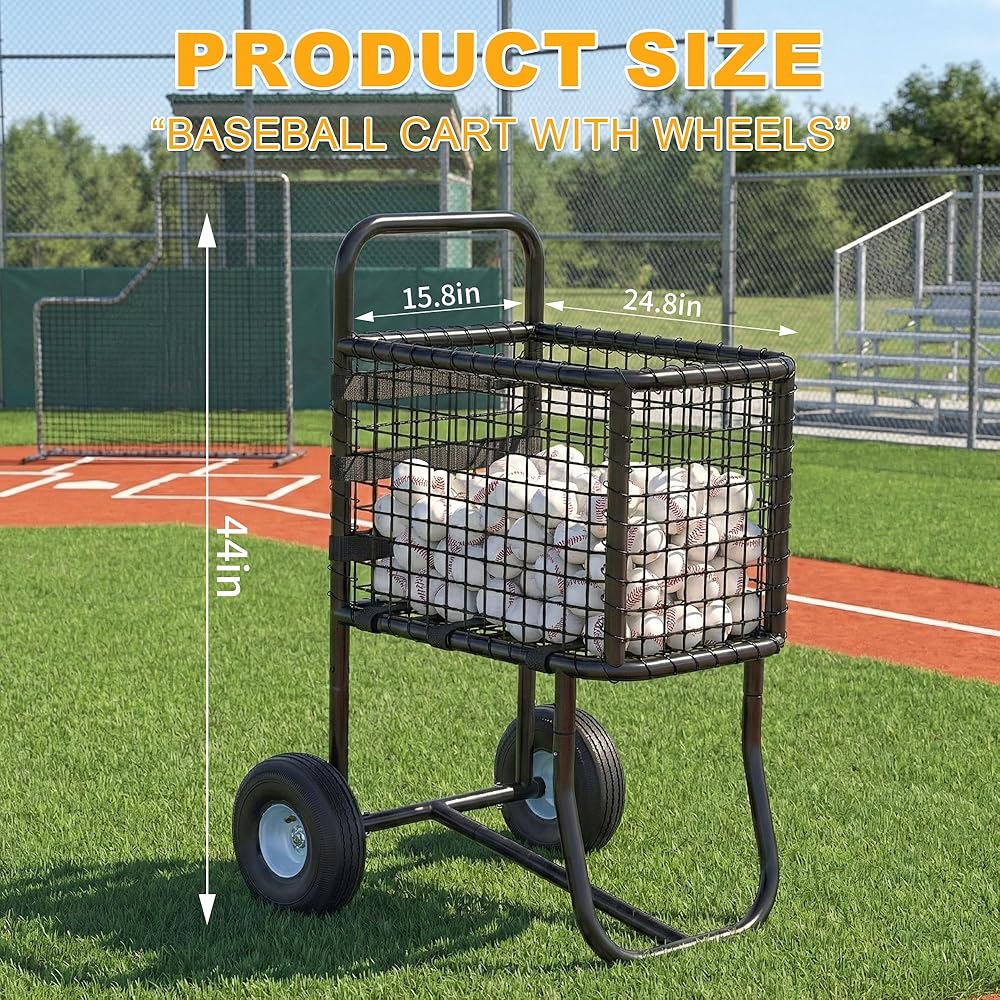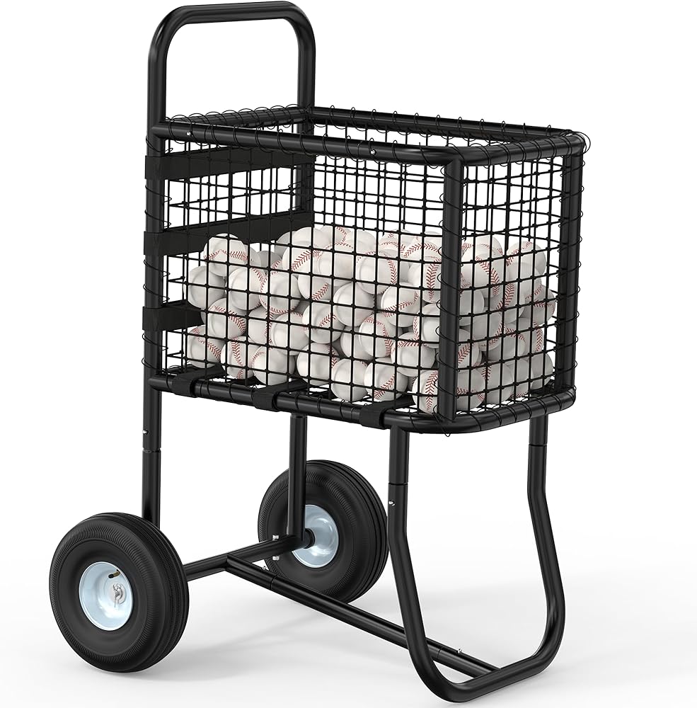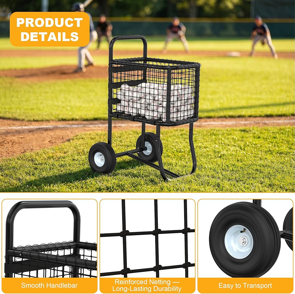 ارتفاع مريح 50 بوصة - لا مزيد من الانحناء: الارتفاع الإجمالي الطويل والمقبض المريح يسمحان للمدربين واللاعبين بدفع أو سحب عربة كرة البيسبول بشكل مريح دون إجهاد. يوفر تصميم السلة المفتوحة الوصول السريع للكرة أثناء التدريبات