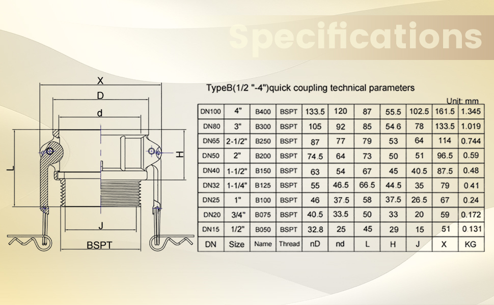 تتضمن العبوة: 2 × 2 بوصة تركيبات Camlock أنثى من النوع B.