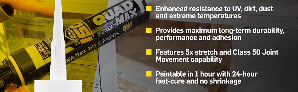 Discover mother nature's worst nightmare: OSI QUAD MAX. Acting as the first line of defense against the elements, OSI QUAD MAX Window, Door & Siding Sealant delivers the toughness needed to make a job last. Designed for sealing around exterior/interior windows, doors and siding, QUAD MAX is a paintable caulk that bonds to a wide variety of materials such as fiber cement, cedar, brick, stone, coated aluminum, fiberglass, vinyl, PVC, stucco, EIFS, wood, glass, and flashing tapes and Kynar coatings. With proven wet and cold surface application and enhanced resistance to UV and hot and cold weather, OSI QUAD MAX is the versatile and durable caulking choice for professional contractors. OSI QUAD MAX has a fast 24-hour cure and can be painted in 1 hour (dependent on temperature, humidity, and depth of sealant applied). The best window, door and siding sealant OSI offers, QUAD MAX is flexible with 5x stretch and Class 50 Joint Movement capability so you have zero reasons to worry about a job once you've done it right the first time.