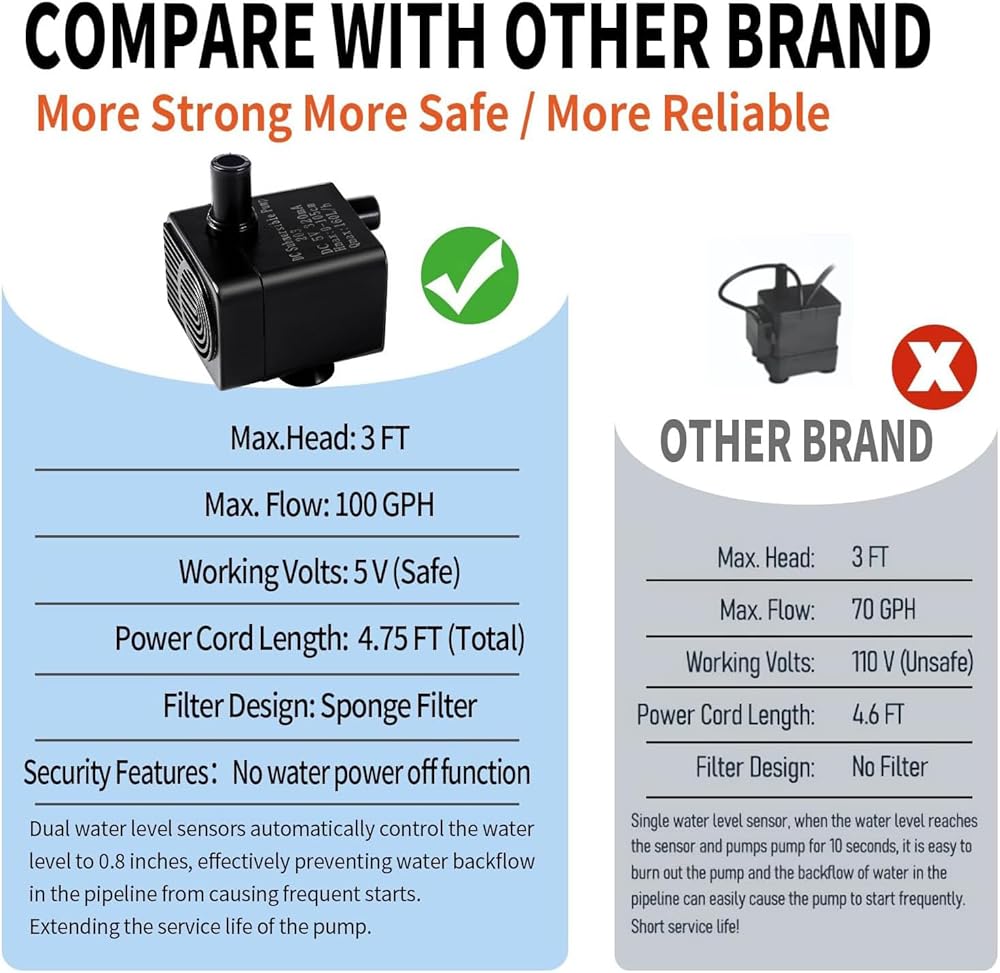Impressive performance: This automatic mini drainage pump has a maximum lift of 3 feet and a maximum flow rate of 100 gallons per hour. Even under harsh conditions, this automatic small submersible pump can drain water quickly and effectively!