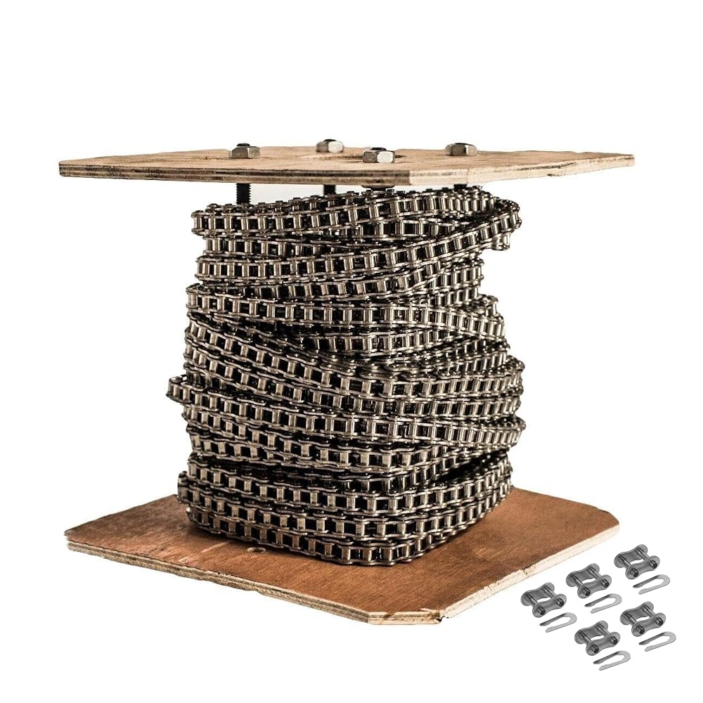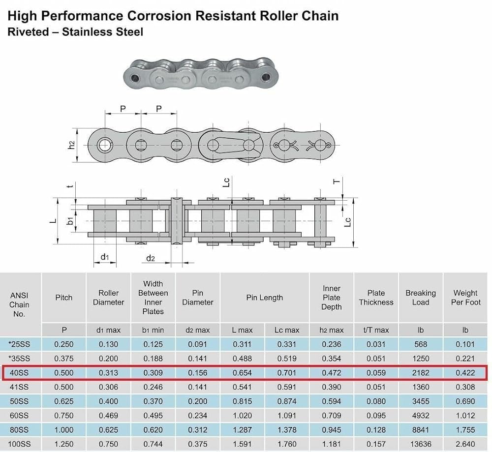 • سلسلة أسطوانية من الفولاذ المقاوم للصدأ ANSI #40 SS بطول 50 قدمًا مع 5 وصلات توصيل / حجم الملعب: 0.500 بوصة / الطول: 50 قدمًا / متوسط قوة الشد: 2182 رطلاً / الوزن لكل قدم: 0.422 رطلًا