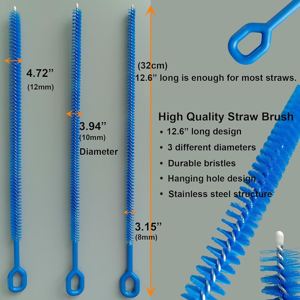 【Multi-Size Kit for Universal Compatibility】The 12.6 inches extra long reusable inches straw cleaner brush kit includes brushes in 3 diameters (8mm -10mm 12mm) and the stainless steel core diameter 2.5mm to fit everything from standard drink straws to wide smoothie straws, stanley cup, baby bottles, and even narrow tubes like CPAP or hookah pipes.