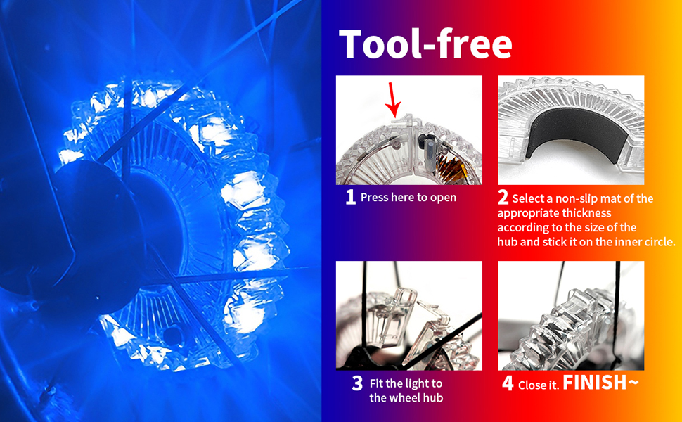 • FAST, EASY INSTALLATION. Bike lights for wheels installation video will have you set up quickly with no tools required. Suitable for bicycles with a wheel axle diameter of 1.42 inches,Both adult bicycles and children's balance bicycles are acceptable.