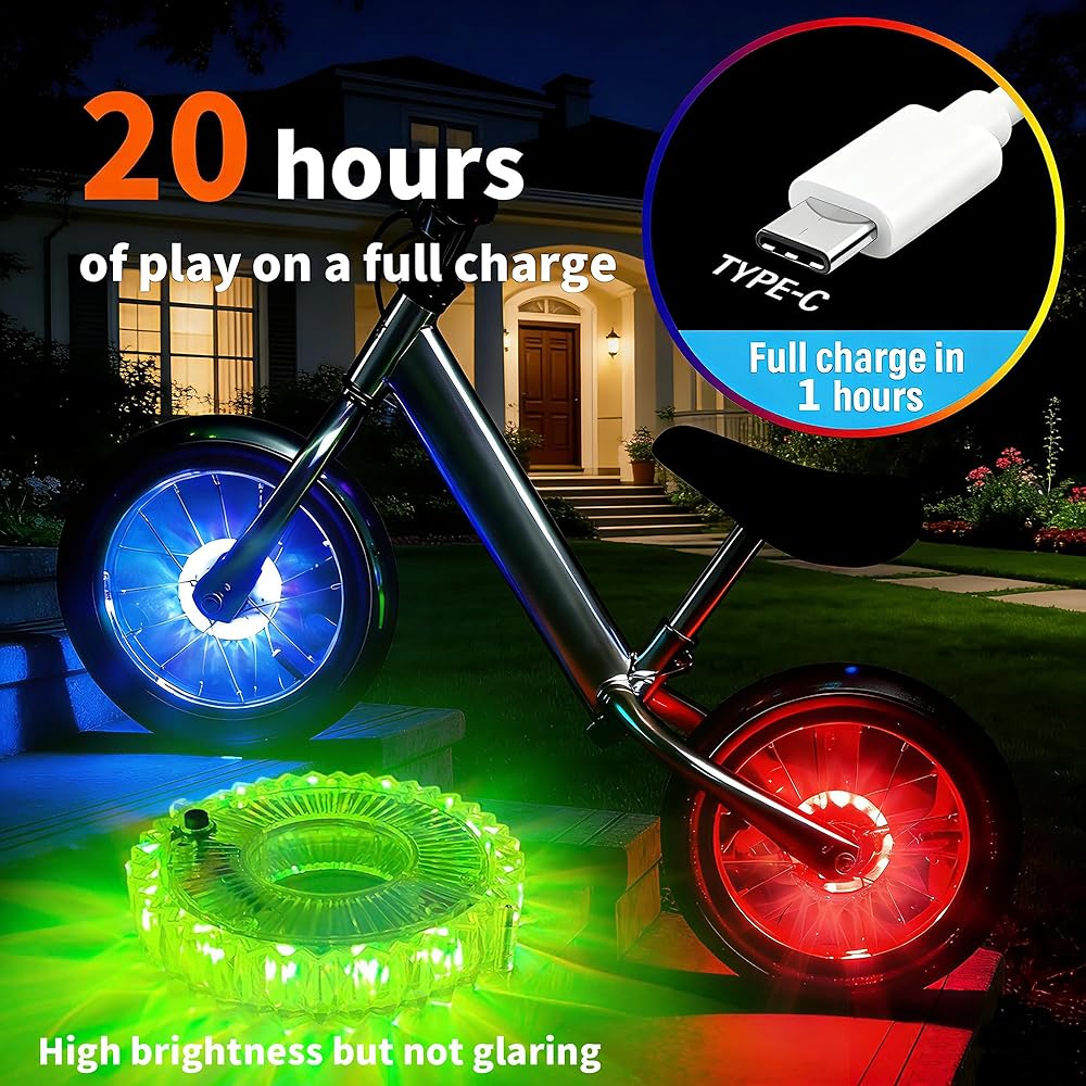 • RECHARGEABLE! Bicycle wheel lights can be fully charged after 1 hour of charging, with a range of 16 hours. Night riding for one hour per day can last for 16 days. Don't worry about spending money to buy batteries!
