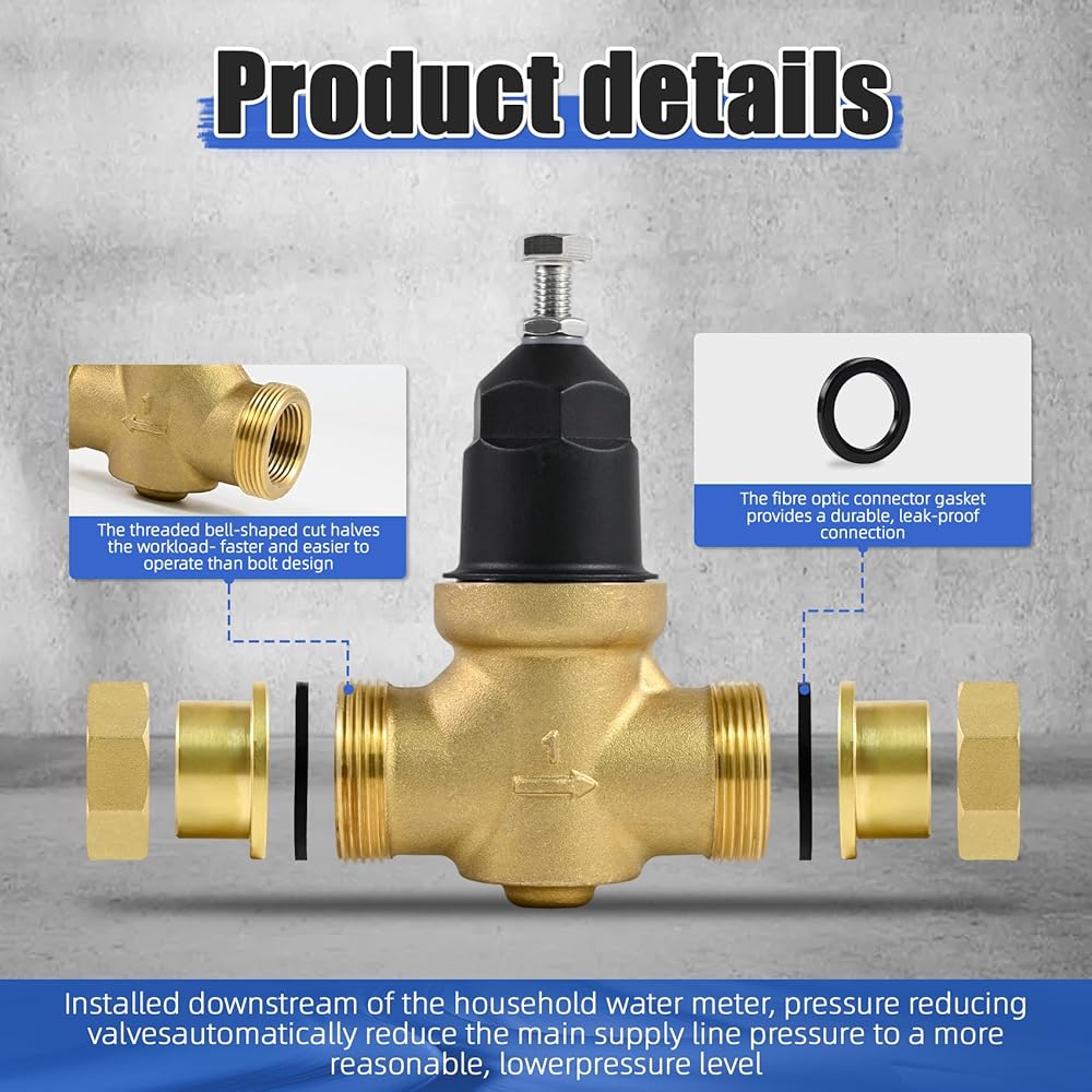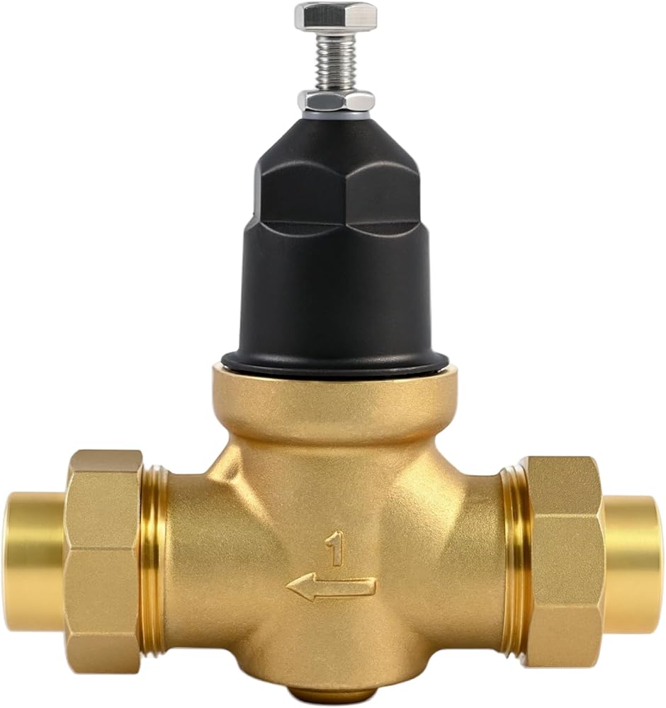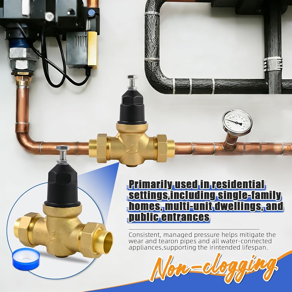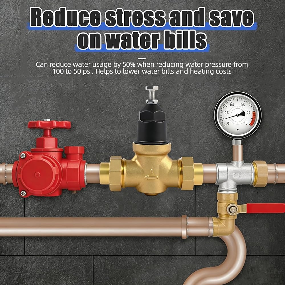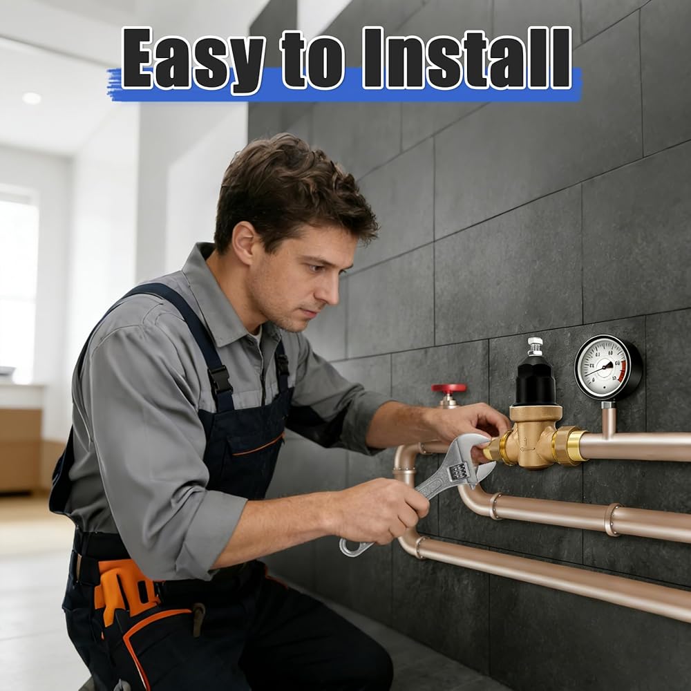 Precise Pressure Control: Factory preset to 50 psi (3.4 bar) for optimal home water pressure, with an adjustable range of 15–75 psi (1.0–5.2 bar). Easily adjust to your specific needs to prevent water hammer, pipe leaks, and damage to faucets, appliances, and plumbing systems