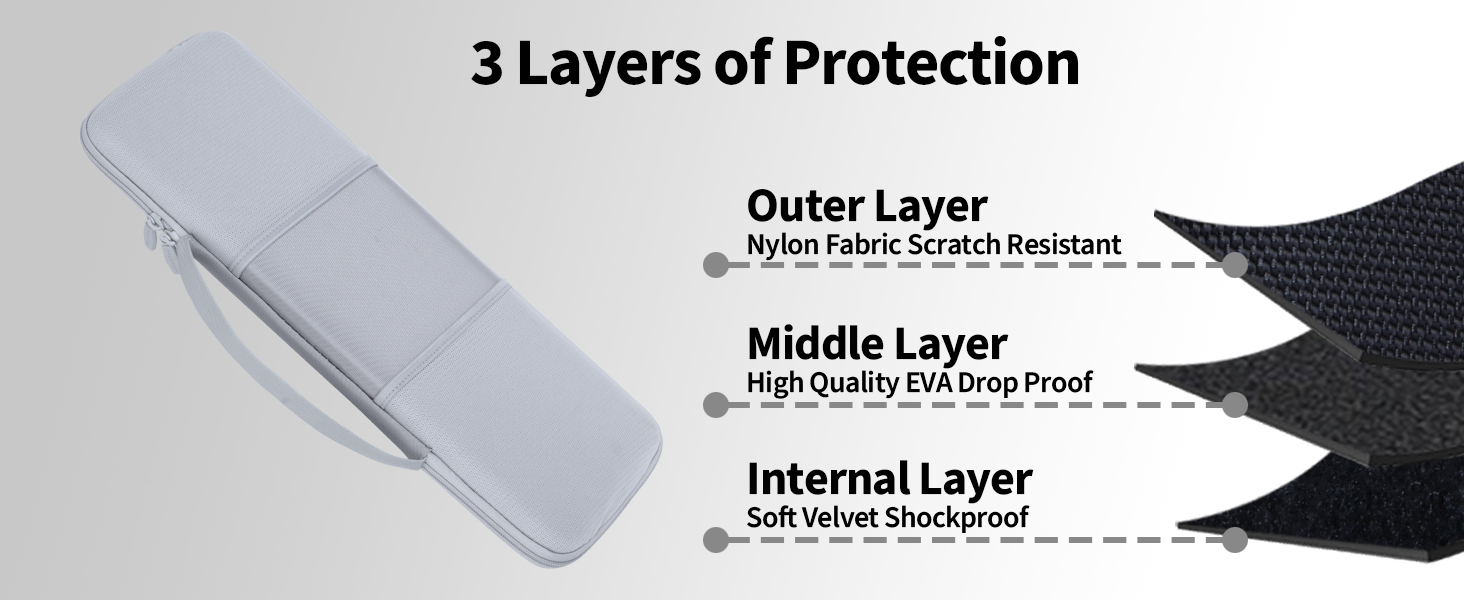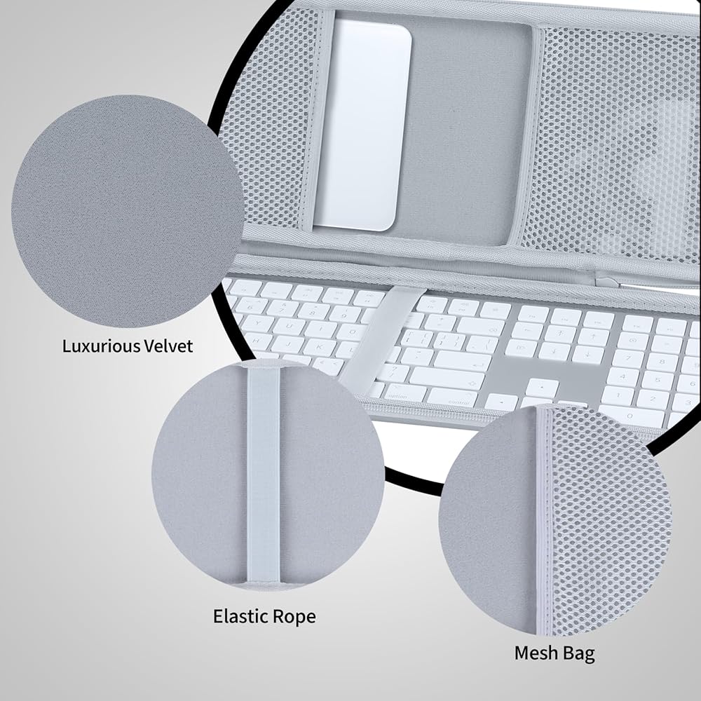 • الجزء الخارجي من الحافظة: مصنوع من مزيج قوي من النايلون وEVA، وقد تم تصميم الجزء الخارجي من حافظة لوحة المفاتيح السحرية من Apple لتحمل الاستخدام اليومي والسفر. توفر هذه المواد متانة استثنائية ومقاومة للخدش وامتصاص الصدمات، مما يضمن بقاء لوحة مفاتيح Apple Magic الخاصة بك مع لوحة مفاتيح رقمية لجهاز Mac محمية حتى في البيئات الخارجية أو التنقلات. يقاوم الغلاف الخارجي القوي الكشوط والخدوش، مما يحافظ على مظهر الجراب الخاص بك جديدًا