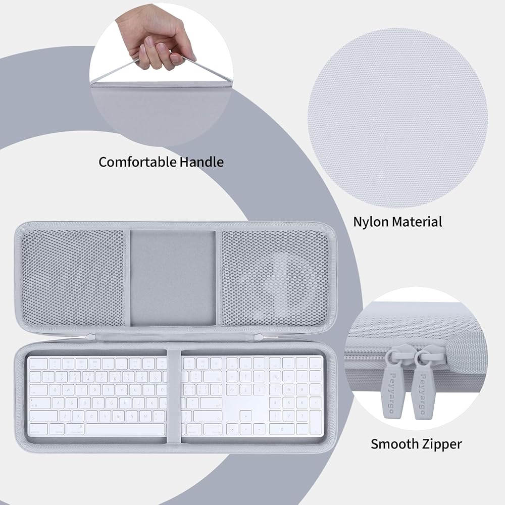 • تصميم بسيط: تتميز حافظة Peyyargo بحزام مرن للحفاظ على لوحة مفاتيح Apple اللاسلكية الخاصة بك في مكانها بشكل آمن. تم تجهيز الحافظة بجيوب شبكية في الداخل والخارج، والتي يمكن استخدامها لتخزين الملحقات مثل الفئران وكابلات البيانات. يضمن السحاب الناعم شديد التحمل سهولة الفتح والإغلاق، لإبعاد الغبار والحطام عن لوحة مفاتيح Apple الرقمية الخاصة بك ولوحة مفاتيح البلوتوث اللاسلكية. تجمع هذه الحافظة بين الحماية العملية والجمال الحديث الذي يكمل إعداد Apple الخاص بك