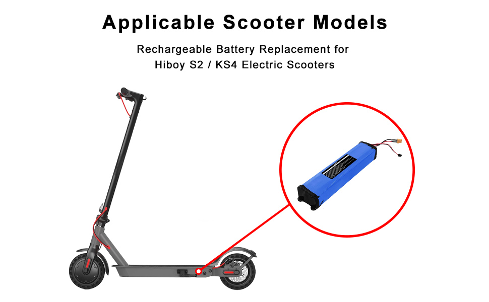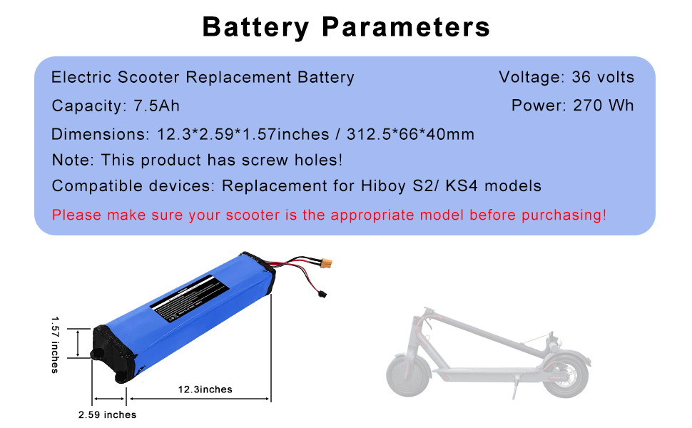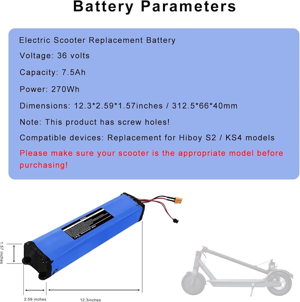 بطارية بديلة 36 فولت 7500 مللي أمبير في الساعة لجهاز Hiboy S2/ Hiboy KS4 مع حزمة بطارية ليثيوم عالية الأداء بقدرة 270 وات في الساعة مع فتحات لولبية، الحجم: 1.57 * 2.59 * 12.3 بوصة