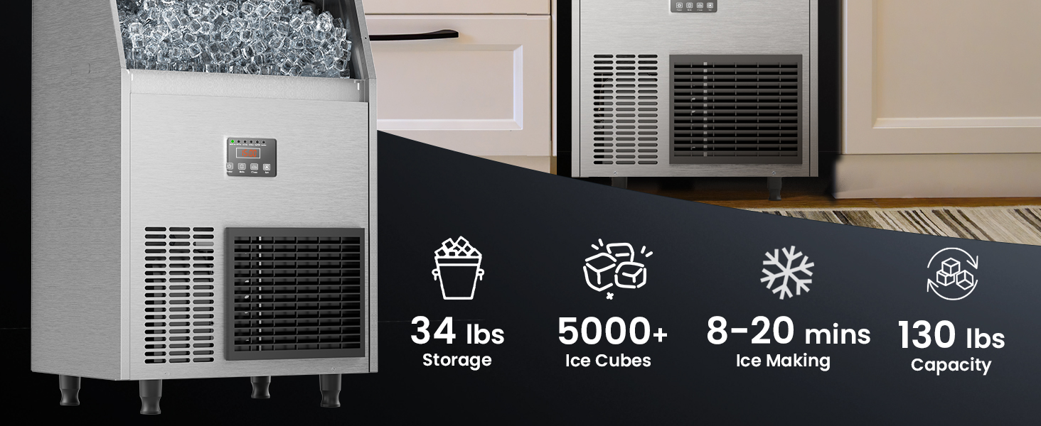 إنتاج ثلج يومي يبلغ 130 رطلاً: باستخدام ضاغط R-290 عالي الكفاءة وتبريد الهواء، تنتج آلة صنع الثلج ما يصل إلى 130 رطلاً. من الثلج الشفاف يوميًا، لن تتركك هذه الوحدة أبدًا منتشيًا وجافًا في قسم الثلج وستحول بار منزلك أو مطبخك إلى ملاذ للمشروبات الفاخرة. يمكن لصندوق الثلج الداخلي المستقل تخزين ما يصل إلى 34 رطلاً. للمساعدة في توفير وقتك الثمين واستخدام الثلج دون انتظار.