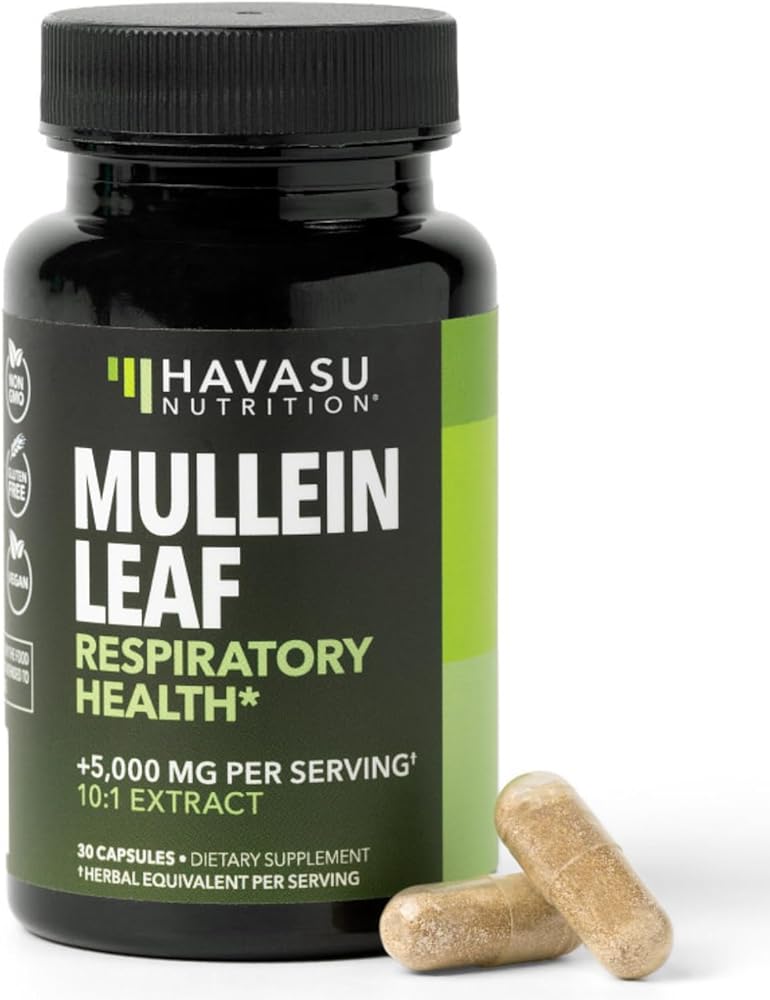 Havasu Nutrition's Mullein Leaf Capsules provide a convenient herbal supplement designed to complement respiratory and throat wellness routines. Each capsule delivers 500mg of mullein leaf extract in an easy-to-take format suitable for everyday use. Mullein leaf has long been valued in traditional herbal practices and is commonly chosen to complement seasonal wellness and throat comfort. Its plant compounds make it a popular ingredient in herbal supplements focused on maintaining respiratory and upper airway wellness. This mullein extract offers a concentrated herbal option compared to loose powders, delivering consistent servings in a convenient capsule format. With one capsule per serving, it provides a simple addition to a balanced supplement routine. The formula is vegan, non-GMO, and gluten free, providing a clean herbal option without unnecessary additives. At Havasu Nutrition, our supplements are formulated, encapsulated, and third-party tested in the USA to help ensure purity and consistency. Whether incorporated into seasonal wellness routines or general herbal supplementation, these mullein capsules offer a practical option for individuals seeking a traditional botanical ingredient in capsule form. Directions: Adults, take one capsule preferably with a meal. Caution: Use only as directed. Consult your healthcare provider before use if you are contemplating pregnancy, pregnant, nursing, have any medical condition, or use any medications. For adult use only. Keep out of reach of children. Do not use if safety seal is damaged or missing. Store in a cool, dry place. Dietary Supplement - 30 Servings per Container with a Serving Size of 1 Capsule. These statements have not been evaluated by the Food and Drug Administration. This product is not intended to diagnose, treat, cure, or prevent any disease.