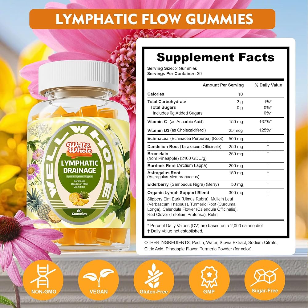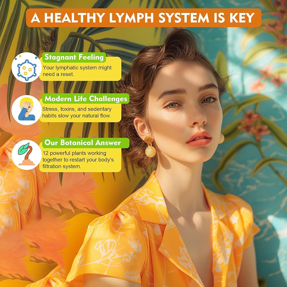 التطهير اللمفاوي والتخلص من السموم: تساعد المكونات العشبية الموجودة في مكملات التصريف اللمفاوي - إشنسا وجذر الهندباء وجذر الأرقطيون - على تعزيز الدورة اللمفاوية الصحية. إنها تدعم عمليات الجسم الطبيعية للتخلص من النفايات الأيضية والسوائل الزائدة، مما قد يساهم في الشعور بالانتعاش.