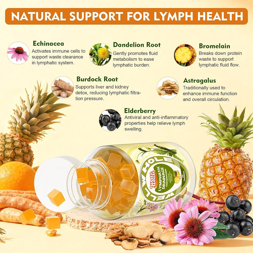 علكات التصريف اللمفاوي بشكل جيد وكامل، مكملات التصريف اللمفاوي مع إشنسا، الهندباء، الأرقطيون، دعم نظام اللمف، تنظيف السموم اللمفاوية ودعم المناعة، الأناناس، فاجان، 60 علكة
