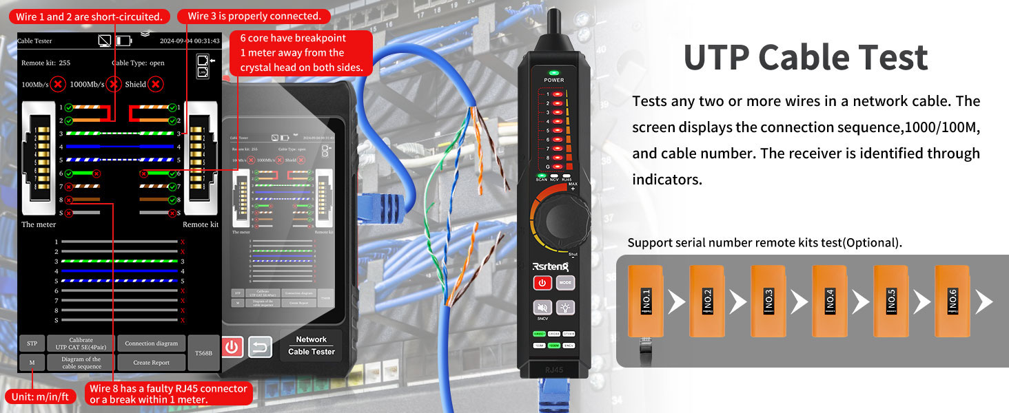 【UTP & Tracer & RJ45 TDR & Length】يمكن لاختبار كابل UTP المتقدم اختبار تسلسل كابل UTP ونوعه ومجموعة أدوات التحكم عن بعد بسهولة. يمكن لمتتبع كابل Ethernet اكتشاف الكابل المستهدف بسرعة من كابلات الفوضى. يمكن لاختبار RJ45 TDR بسهولة اختبار حالة الزوج والطول والتوهين والانعكاس والمقاومة والانحراف والمعلمات الأخرى، بحد أقصى 180 مترًا (590 قدمًا). جهاز قياس طول الكابل يفتح كابلات الشبكة، أقصى طول للقياس يصل إلى 3000 متر. الدقة: طول الكابل × 3% ± 1 متر.