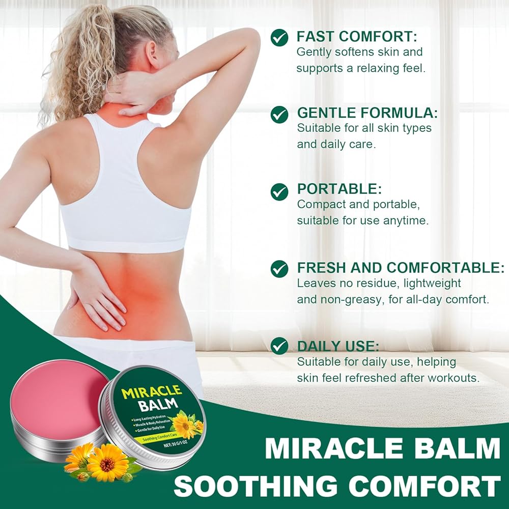 【تعليمات الاستخدام السهلة】----- للحصول على أفضل النتائج، ضعيه على بشرة نظيفة وجافة. خذ كمية صغيرة من Miracle Balm وقم بتدليكها بلطف على المنطقة المرغوبة - مثل الساقين أو الظهر أو اليدين - حتى يتم امتصاصها بالكامل. استخدميه يوميًا أو حسب الحاجة لراحة مستمرة.
