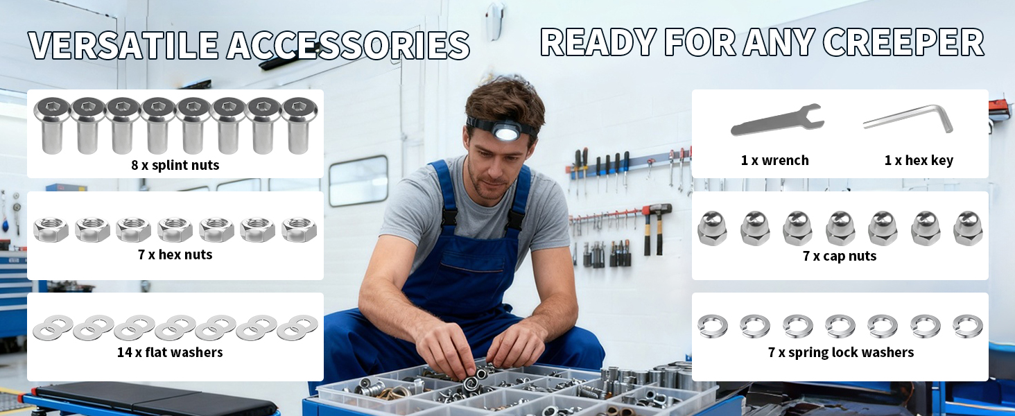 • توافق واسع: تتوافق عجلاتنا الزاحفة مع أي مقعد جراج أو زاحف تقريبًا، مثل الزاحف الميكانيكي وعربات الخدمة والخزائن والمقاعد والكراسي والمزيد.