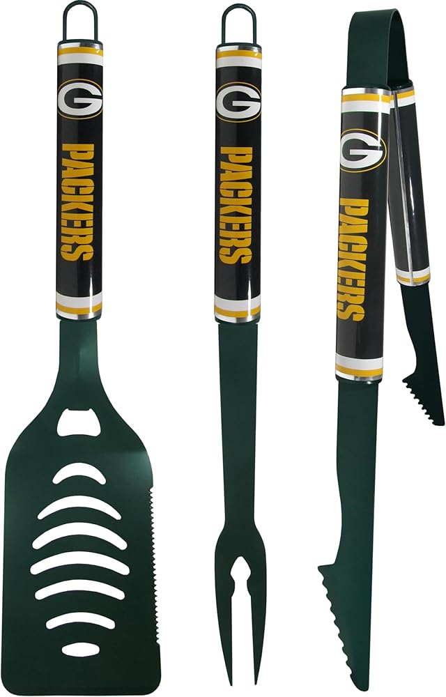 The eye-catching team logo graphics on this set make it a game day favorite! The high-quality, 3 pc BBQ grill set will make any grill master smile. These barbeque tools are made to last whether you are using them for camping, tailgating or a patio party you will have quality grill tools for years to come. The set includes a large spatula with a bottle opener feature and sharp serrated edge, strong tongs and fork all in a team color. The 17 inch length keeps you far from the flames. The quality of the tools make them a great choice for Father's Day or Christmas gifts, they are really a grill accessory must have.
