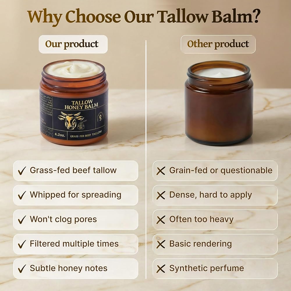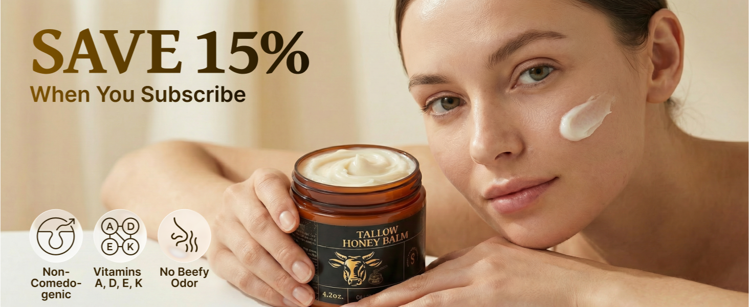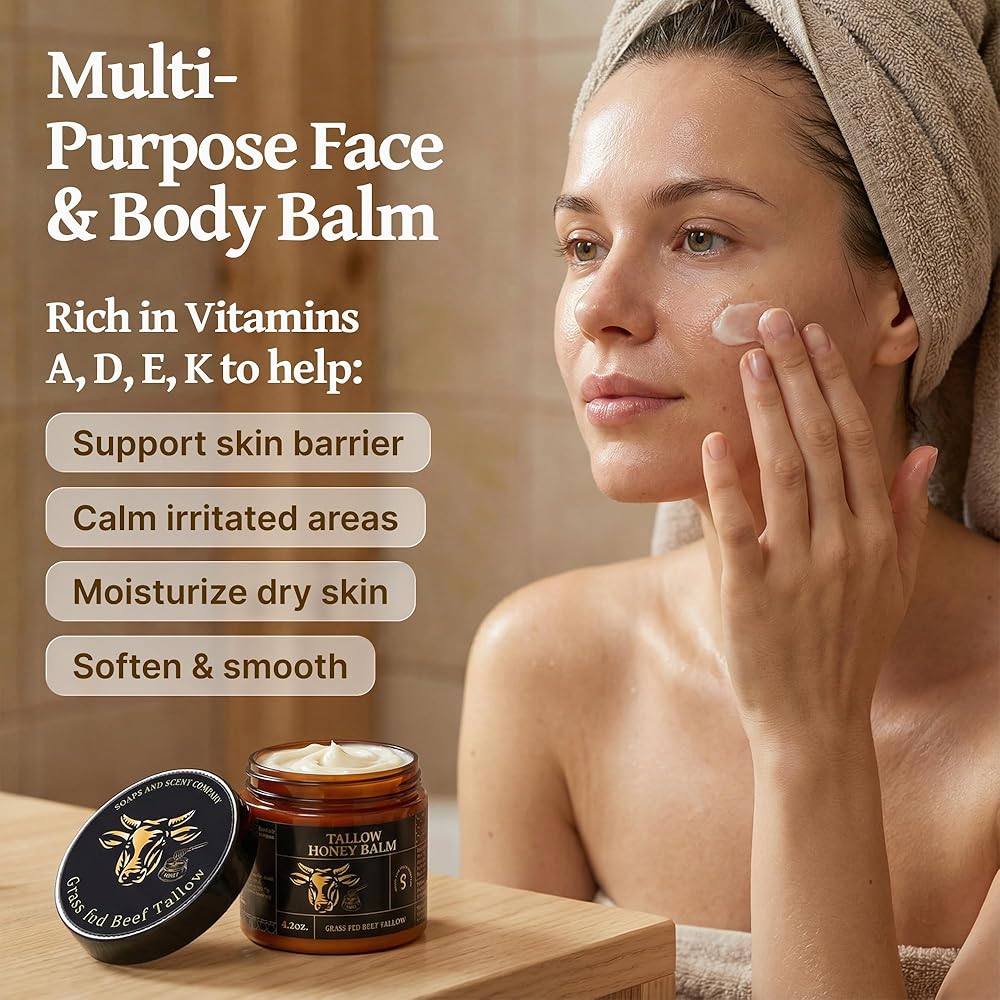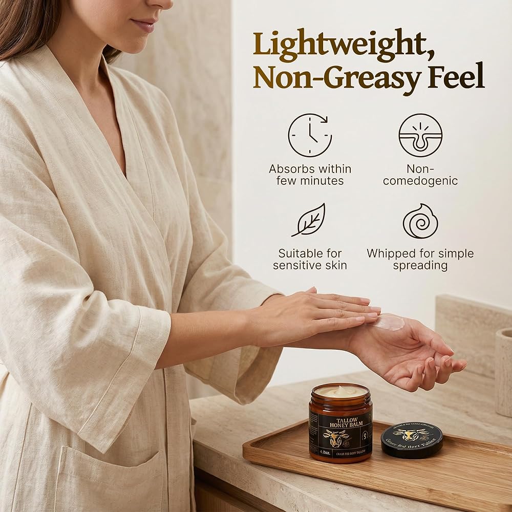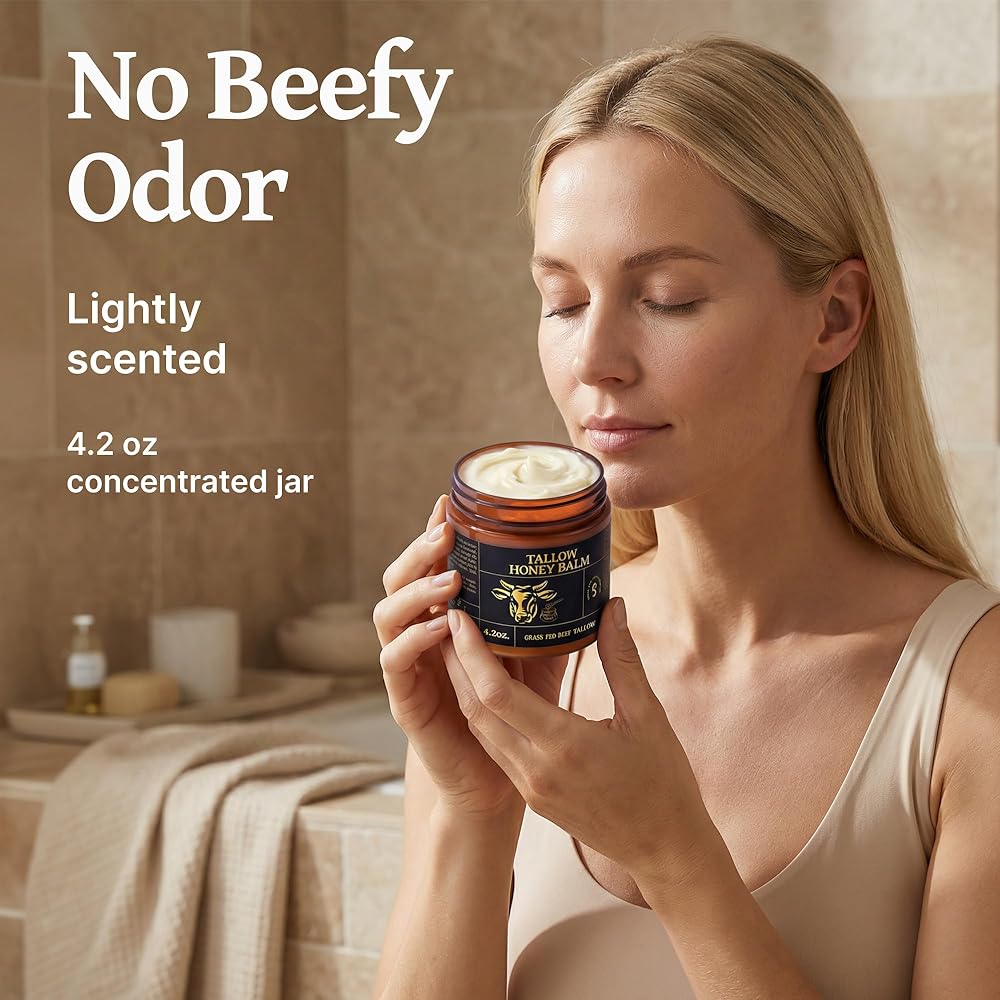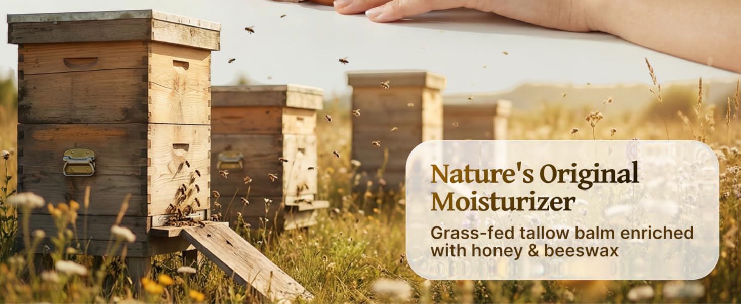 مكونات طبيعية: مصنوعة من لحم البقر الذي يتغذى على العشب والعسل وشمع النحل، مما يوفر العناصر الغذائية الأساسية والفيتامينات لتغذية البشرة.