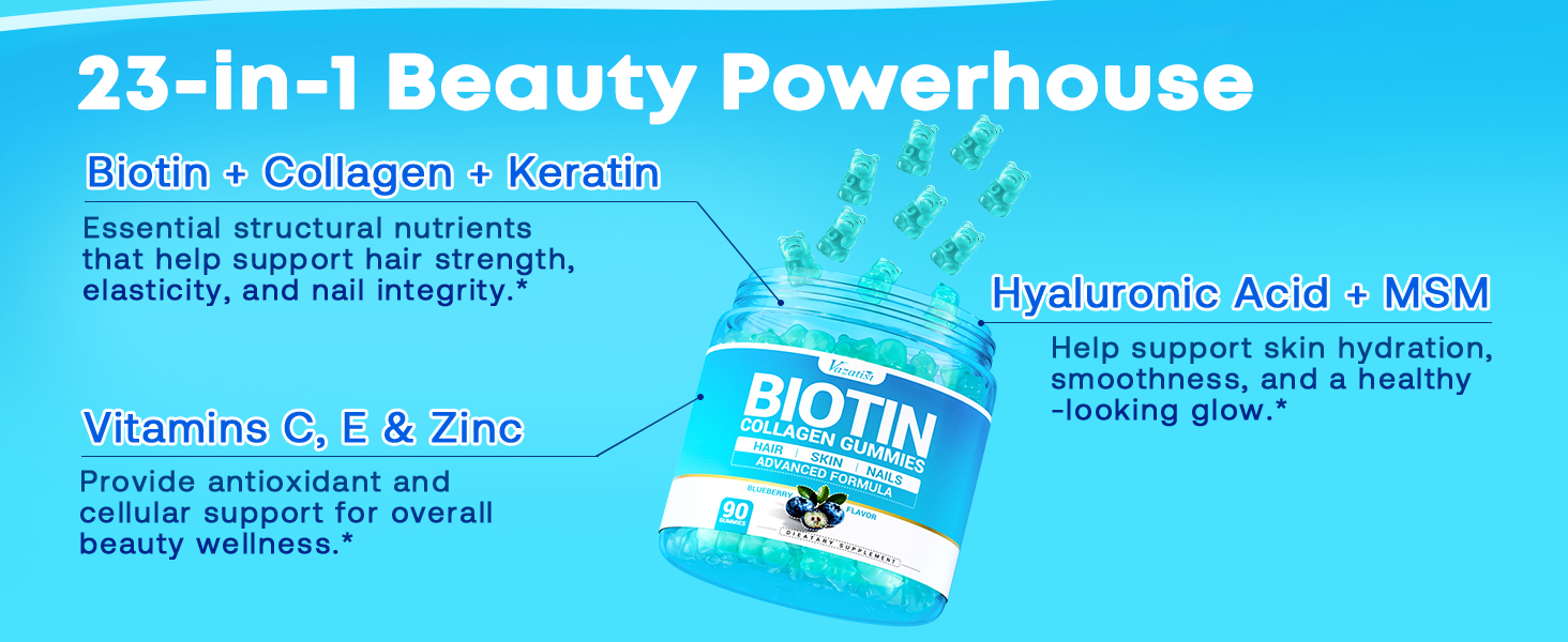 • تركيبة 23 في 1 للشعر والبشرة والأظافر: توفر علكة البيوتين لدينا بيوتين قوي 10000 ميكروجرام لكل وجبة، جنبًا إلى جنب مع علكة الكولاجين (2500 ملجم) والكيراتين وحمض الهيالورونيك وMSM والزنك ومجموعة كاملة من الفيتامينات الأساسية (A وC وD3 وE وB-Complex). تساعد هذه العلكة المتقدمة لأظافر البشرة والشعر على دعم شعر أقوى وبشرة أكثر نعومة وأظافر أكثر صحة.
