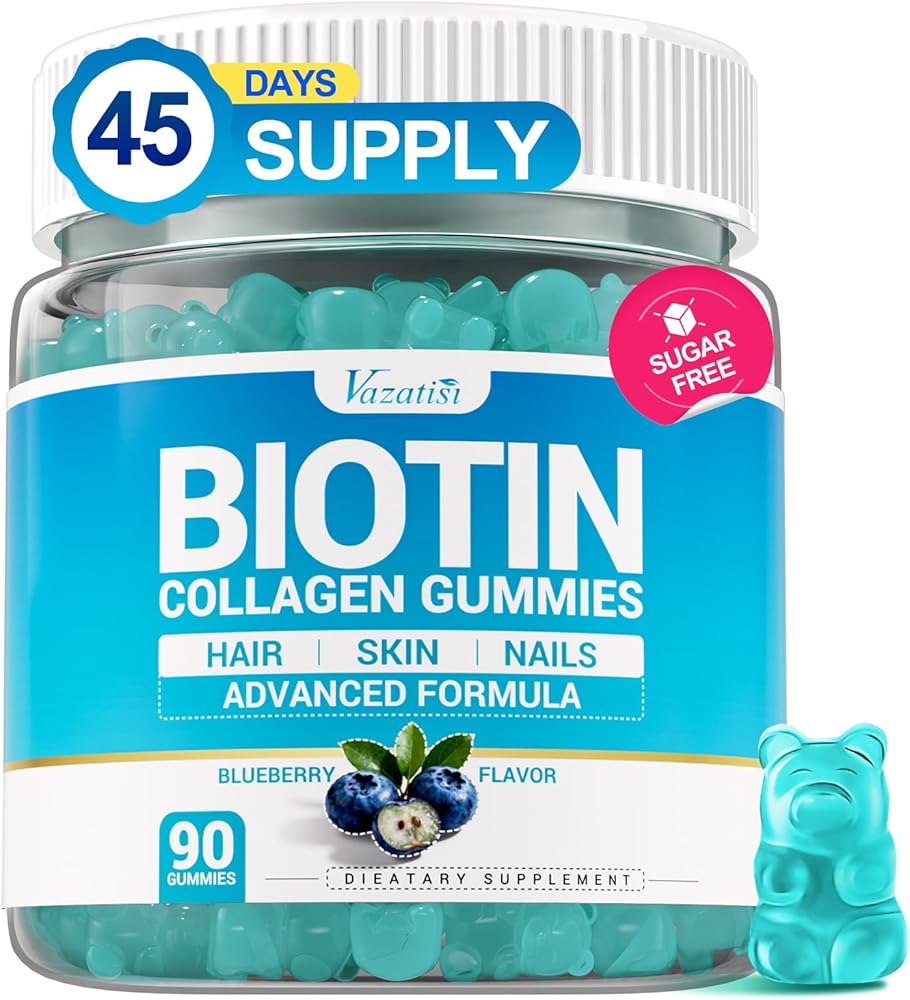 علكات البيوتين 10000 ميكروجرام مع الكولاجين - علكات نمو الشعر 23 في 1 للنساء والرجال - علكات الشعر والبشرة والأظافر مع الكيراتين والبلميط المنشاري - خالية من السكر وغير معدلة وراثيًا، التوت الأزرق، 90 قطعة