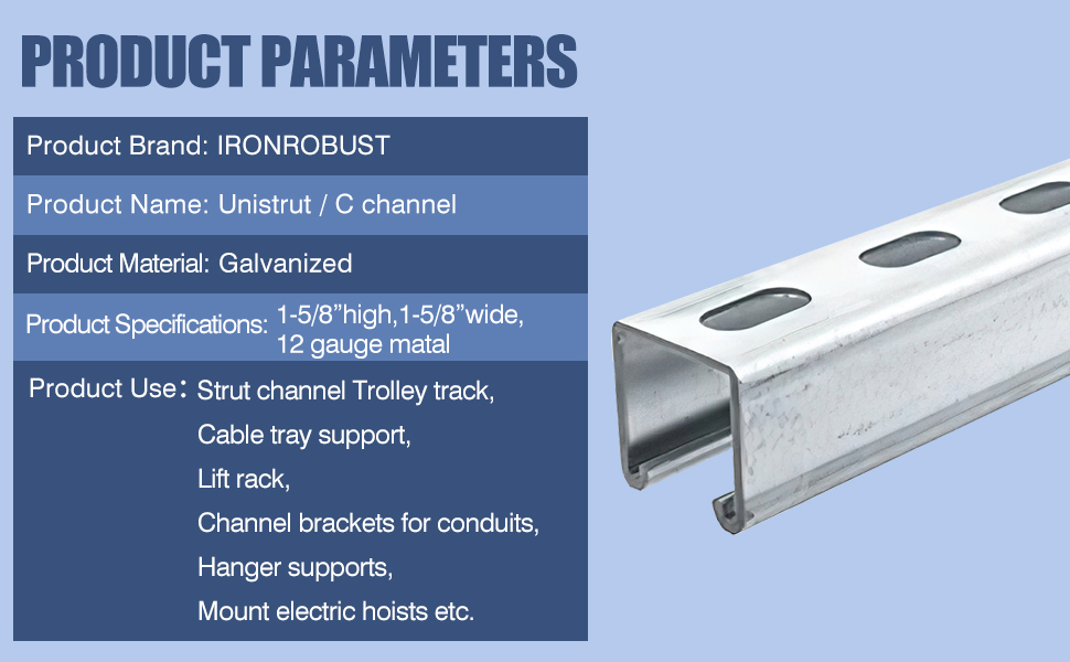 12 Gauge Steel Construction – Made from heavy-duty 12 gauge steel U-channel to provide stable support for mounting, hanging, and overhead trolley applications.