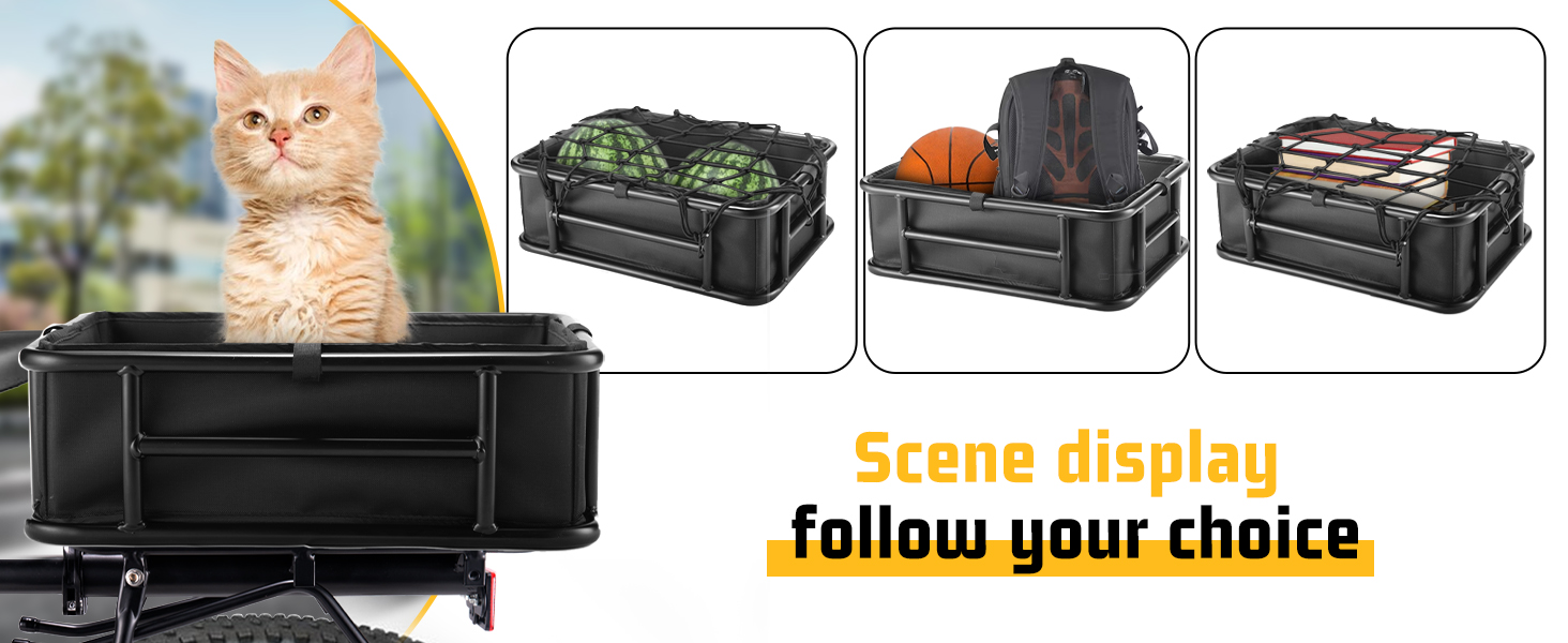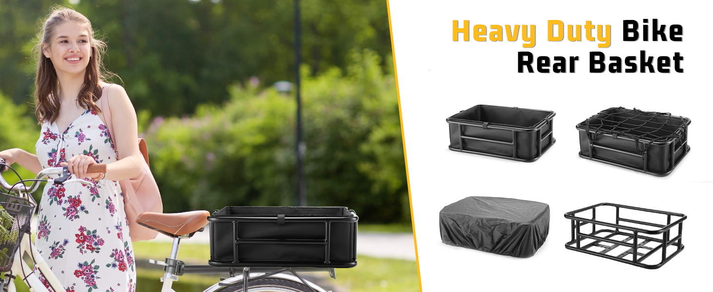 صندوق تغيير السلة: تتضمن سلة الدراجة الخلفية لدينا سلة دراجة معدنية، وشبكة شحن، وبطانة سميكة. أثناء الركوب، يمكنك استخدامها لحمل الوجبات الخفيفة وأكواب الماء وغيرها من الأشياء الصغيرة دون القلق بشأن سقوطها.