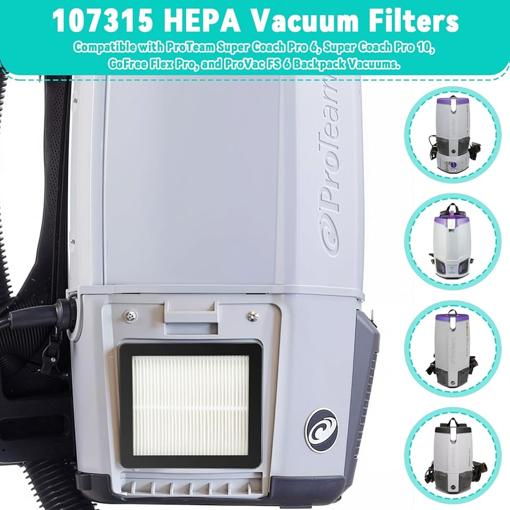 Precise Fit & Broad Compatibility: This HEPA filter is designed as a direct replacement for part number 107315. It seamlessly fits a range of ProTeam backpack vacuums, including the Super Coach Pro 6, Super Coach Pro 10, GoFree Flex Pro, and ProVac FS 6 models, ensuring optimal performance. Fits ProTeam Vacuum Parts: 107303, 107304, 107305, 107306, 107307, 107308, 107309, 107310, 107338, 107339, 107340, 107341, 107342, 107343, 107344, 107371, 107464, 107465, 107467, 107468, 107533, 107534, 107535, 107536, 107537. Superior Filtration Performance: The filter's unique pleated design provides a greater surface area to effectively capture 99.97% of microscopic particles as small as 0.3 microns, including fine dust, pollen, pet dander, and carbon dust, contributing to cleaner exhaust air. Maintains Strong Suction Power: By reducing clogging and increasing airflow, this filter helps maintain your vacuum's strong and consistent suction over time. This enhances cleaning efficiency and helps protect the vacuum's motor by preventing dust bypass. Washable & Reusable Design: Crafted from durable, high-quality materials, this filter is both washable and reusable. Simply rinse with clean water, let it dry completely, and reinstall, offering a cost-effective and environmentally friendly cleaning solution. Quick, Tool-Free Installation: Replacing the filter is incredibly easy and requires no tools. Just twist to unlock the old filter, remove it, and lock the new one into place. This allows for minimal downtime and quick maintenance.
