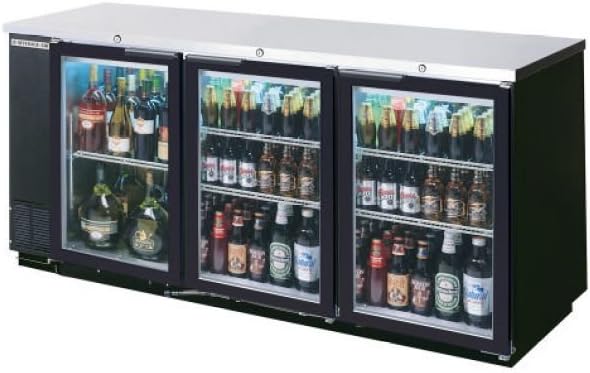 Refrigerated Food Rated Back Bar Storage Cabinet, three-section, 79"W, 37-1/4" H, 33.59 cu. ft., (3) glass doors, snap-in door gasket, (6) epoxy coated steel shelves, (4) 1/2 barrel kegs, LED interior lighting with manual on/off switch, black exterior finish, 2" stainless steel top, stainless steel interior with radius corners is easy to keep clean & meets NSF Standard 7 for open container, left-mounted self-contained refrigeration, R290 Hydrocarbon refrigerant, 1/3 HP, cULus, UL EPH Classified, UL-Sanitation, MADE IN USA