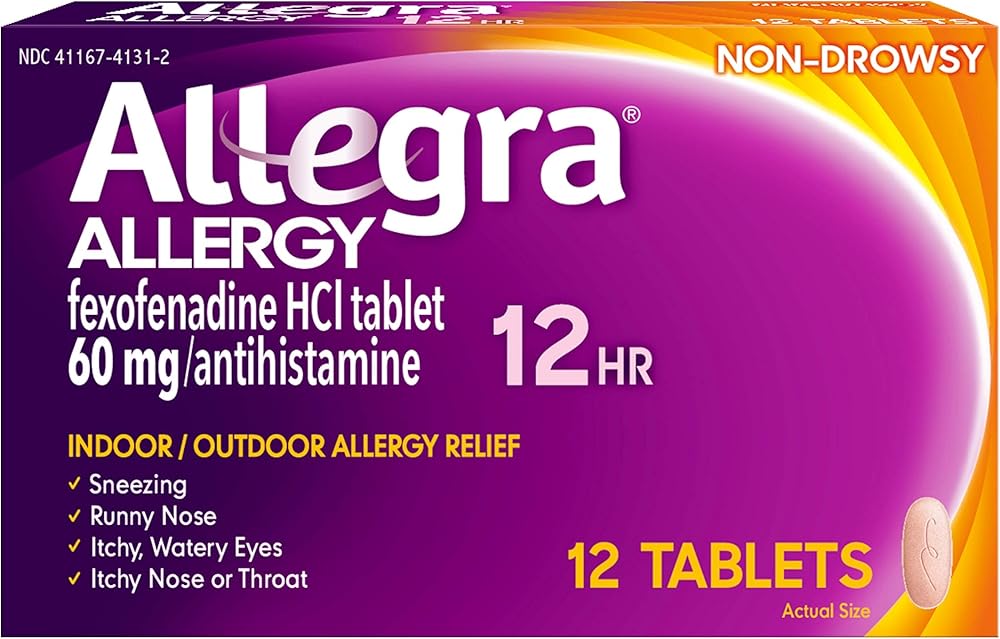 Allegra 12 Hour Tablets (60 mg) provide fast-acting, non-drowsy relief from symptoms associated with seasonal hypersensitivity reactions. Formulated with fexofenadine hydrochloride, a second-generation antihistamine, each tablet is designed to reduce discomfort such as sneezing, runny nose, nasal congestion, itchy throat, and watery or itchy eyes. It also helps manage skin irritation caused by chronic idiopathic hives, a common form of hypersensitivity response. With a 12-hour duration of action, this medication offers extended support throughout the day without causing drowsiness, making it ideal for individuals with active lifestyles. It's recommended for adults and children 12 years and older.