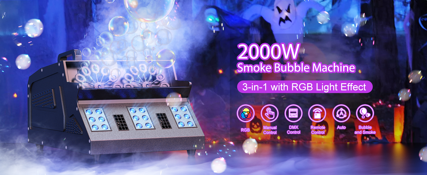 آلة ضباب 2000 وات، آلة فقاعات ضباب 3 في 1 مع مروحتين فقاعات، 18 مصباح LED RGB، فقاعة دخان الكل في واحد، آلة فقاعات لحفلات الهالوين وحفلات الزفاف وأعياد الميلاد