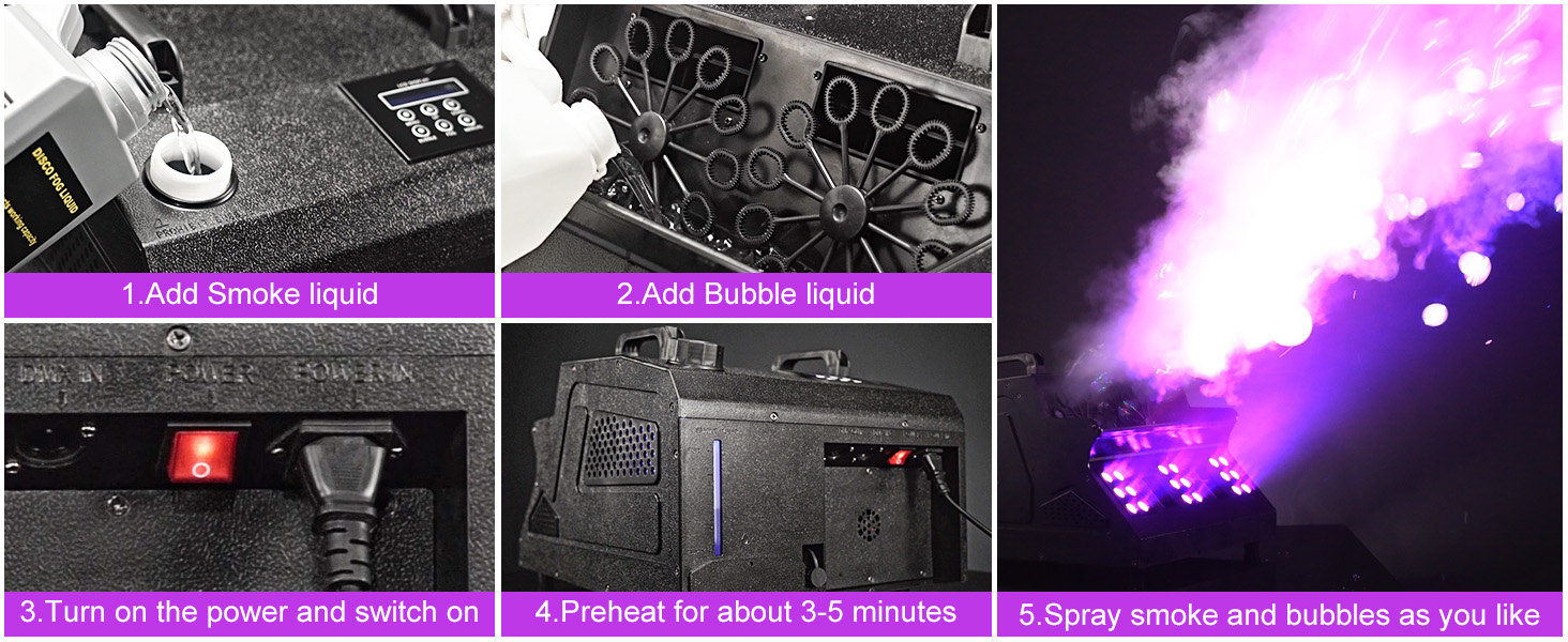 • سهلة الاستخدام: تستغرق آلة الدخان حوالي 3-5 دقائق للتسخين في المرة الأولى، و45-60 ثانية للتسخين في دورة. بعد اكتمال التسخين، يمكن رش الدخان على الفور من خلال إعدادات القائمة. يمكن أن تعمل الفقاعات عند تشغيلها دون تسخين. يمكن استخدام 2 لتر من سائل الفقاعات لمدة 30 دقيقة؛ يمكن استخدام 1 لتر من سائل الدخان لمدة ساعة واحدة. وفي الوقت نفسه، يبلغ ارتفاع رذاذ الدخان الذي يمكننا الوصول إليه 6 أمتار وارتفاع الفقاعة 4 أمتار