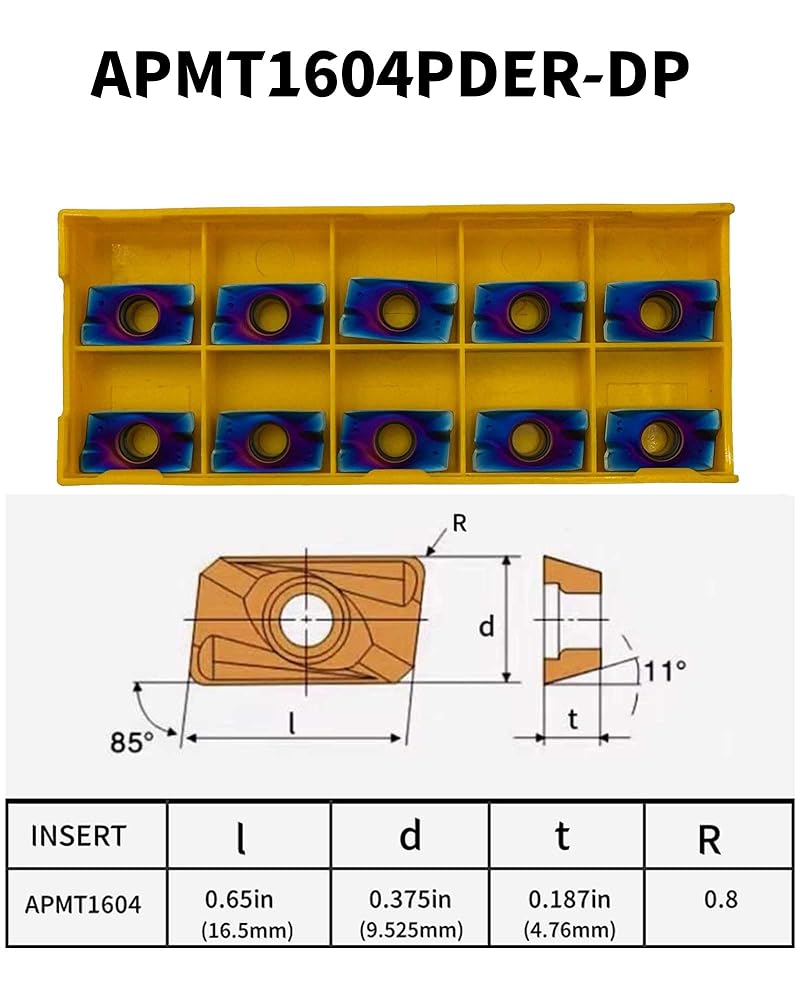 The blue inserts APMT1604:Suitable for Stainless steel , hard steel and quenched steel . The blue nano coating endows inserts strong impact resistance, good versatility with high precision, high finish and high wear resistance.