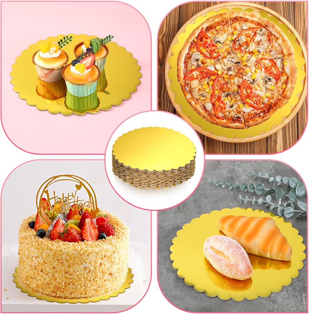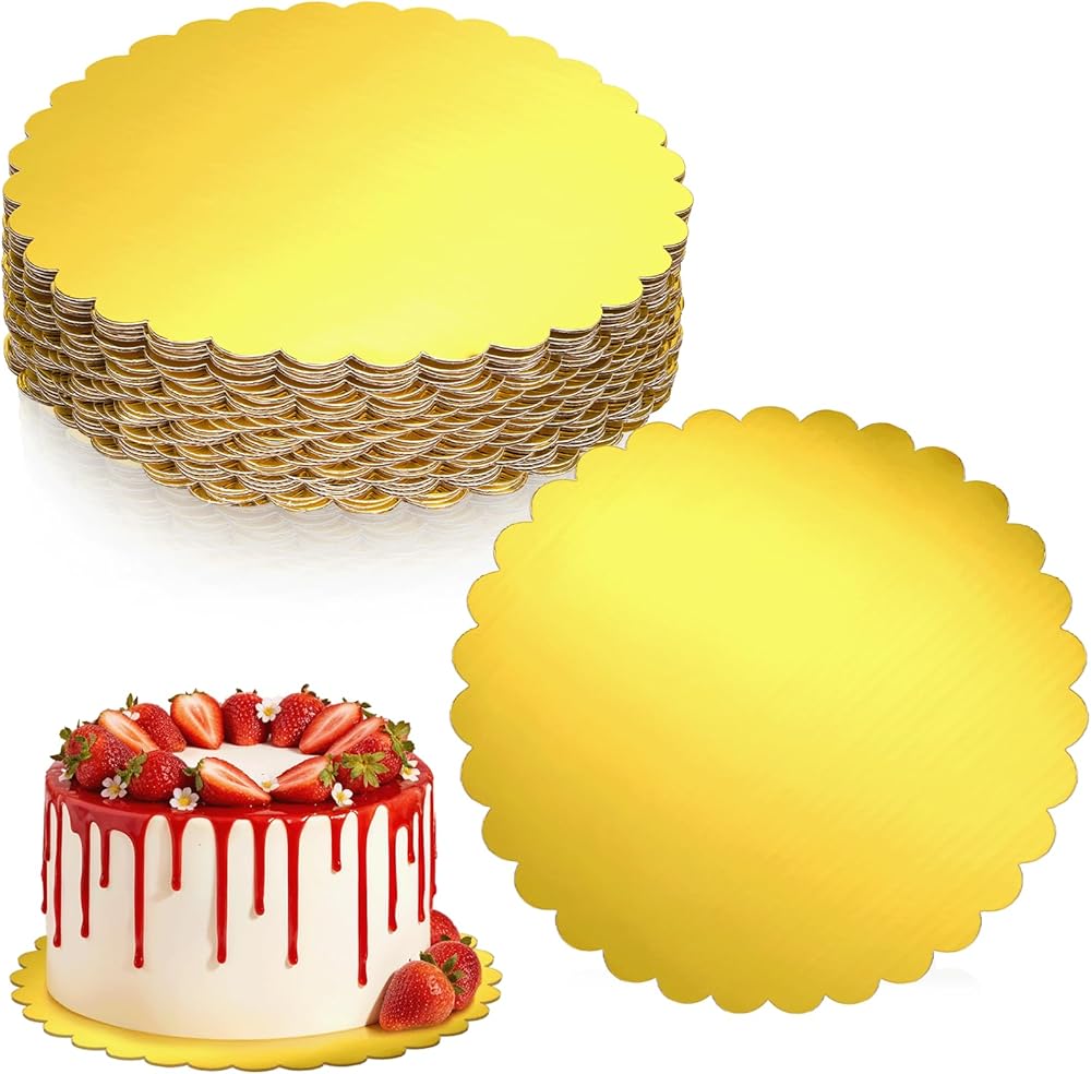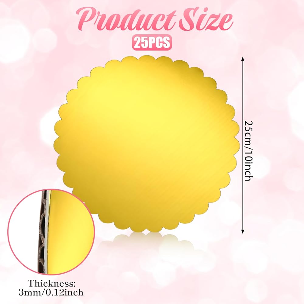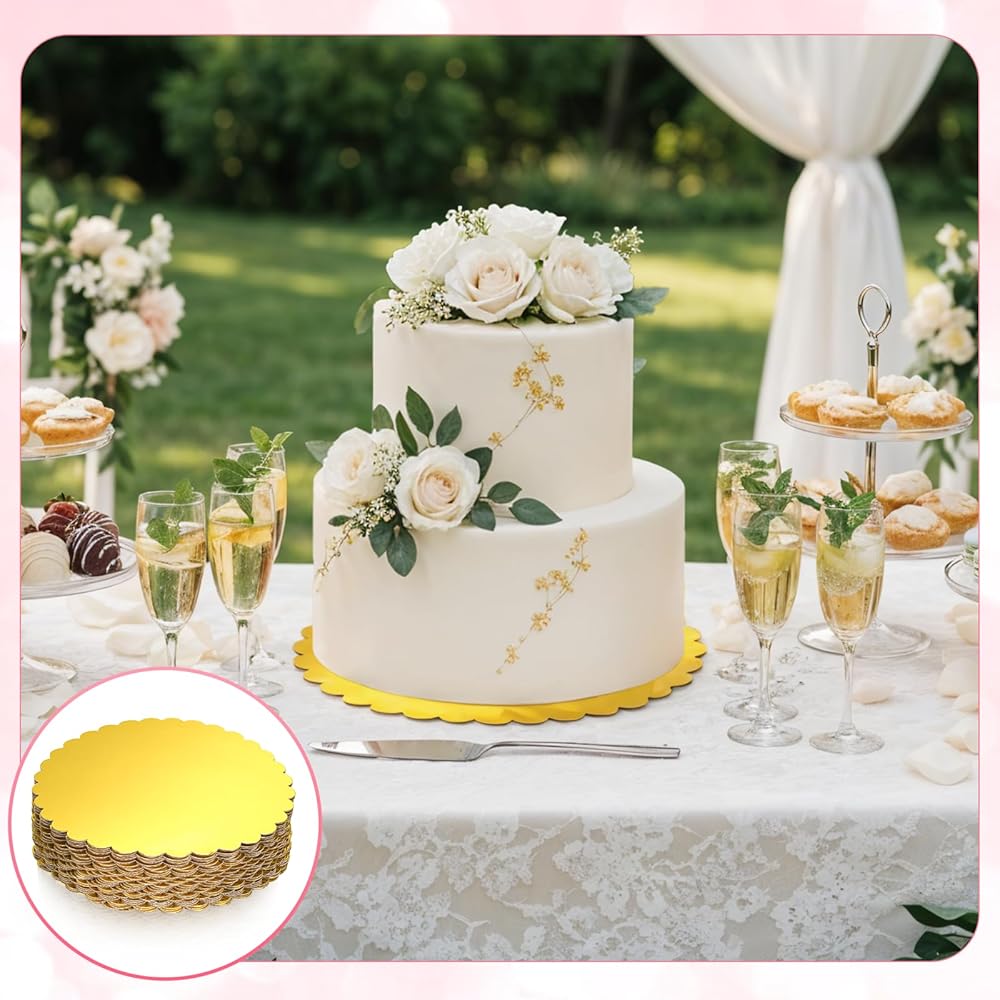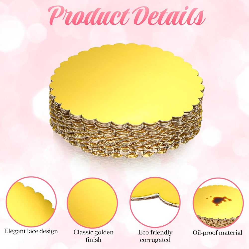 • Elegant Scalloped Edge Design: rounds disposable cake base features delicate waved edges that add a sophisticated decorative touch to cake displays. the refined gold finish enhances visual appeal for weddings, exhibitions, or professional bakery presentations.
