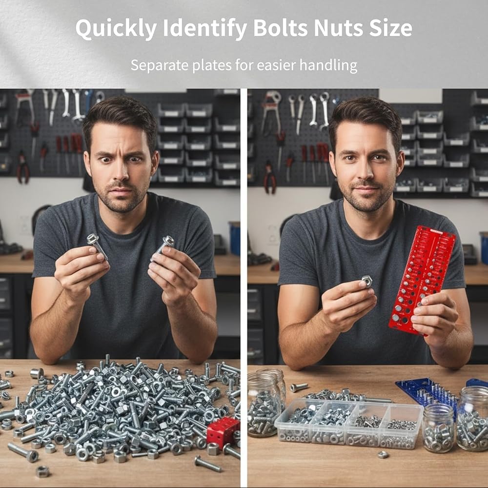 【مدقق خيوط احترافي موفر للوقت】تجنب الرحلات المحبطة إلى متجر الأجهزة باستخدام مقاس المسمار والصواميل الكل في واحد. سواء كنت بحاجة إلى مقياس خيط لولبي لإصلاح الماكينة أو أداة تحديد حجم المسمار للمشروعات التي تصنعها بنفسك، فإن مجموعة فحص خيط الصواميل والمسمار هذه تحافظ على مساحة العمل الخاصة بك منظمة. تتميز بـ 4 فتحات تعليق و8 أقدام سيليكون مضادة للانزلاق للتركيب على الحائط أو استخدام طاولة العمل