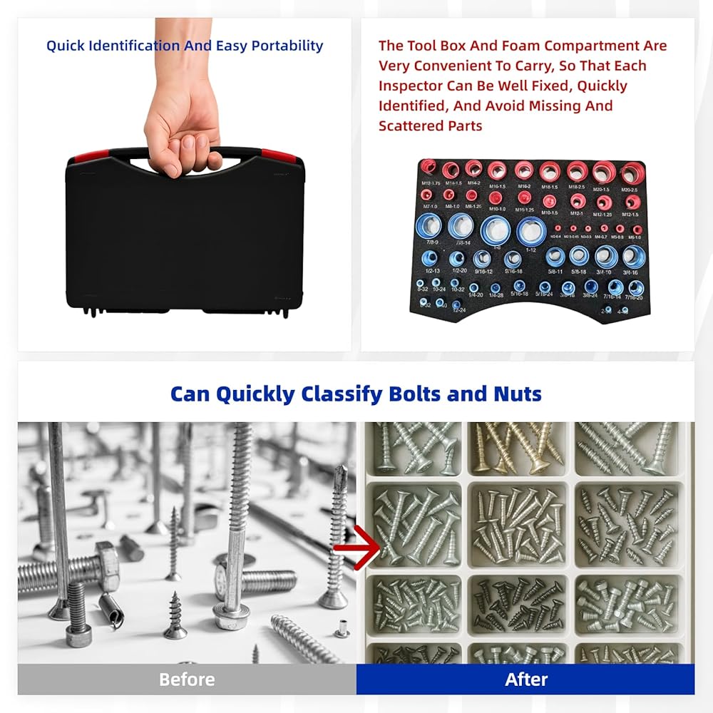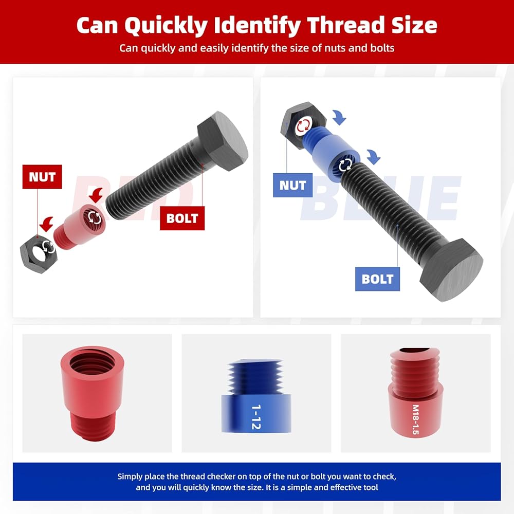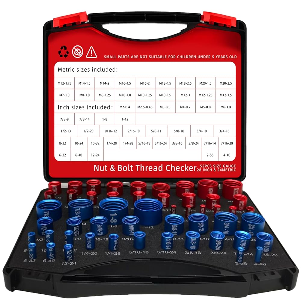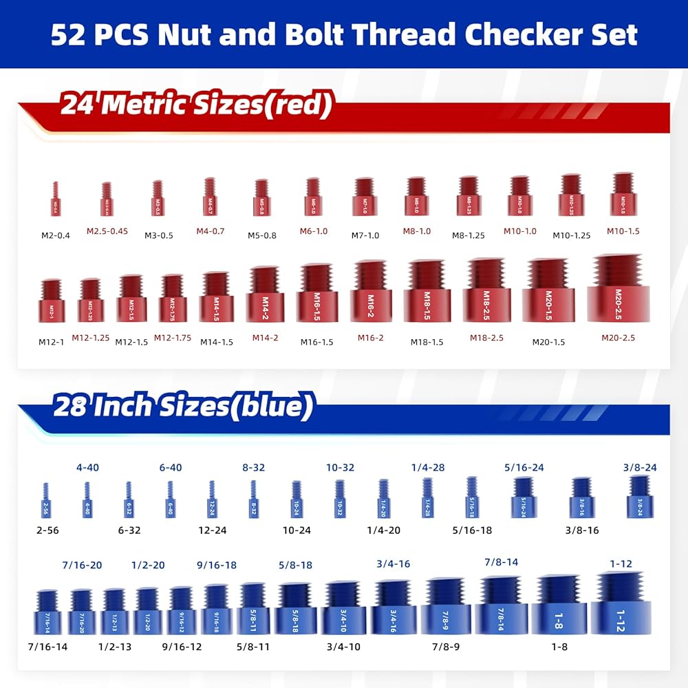 • 52 مفتش خيط يشمل: 28 بوصة و24 متريًا: أحجام بوصة (أزرق): 7/8-9، 7/8-14، 1-8، 1-12، 1/2-13، 1/2-20، 9/16-12، 9/16-18، 5/8-11، 5/8-18، 3/4-10، 3/4-16، 8-32، 10-24، 10-32، 1/4-20، 1/4-28، 5/16-18، 5/16-24، 3/8-16، 3/8-24، 7/16-14، 7/16-20، 6-32، 6-40، 12-24، 2-56، 4-40 الأبعاد المترية (الحمراء): M12-1.75، M14-1.5، M14-2، M16-1.5، M16-2، M18-1.5، M18-2.5، M20-1.5، M20-2.5، M7-1.0، M8-1.5، M10- 1.0 、 M10-1.25 、 M10-1.5 、 M12-1 、 M12-1.25 、 M12-1.5 、 M2-0.4 、 M2.5-0.45 、 M3-0.5 、 M4-0.7 、 M5-0.8 、 M6-1.0